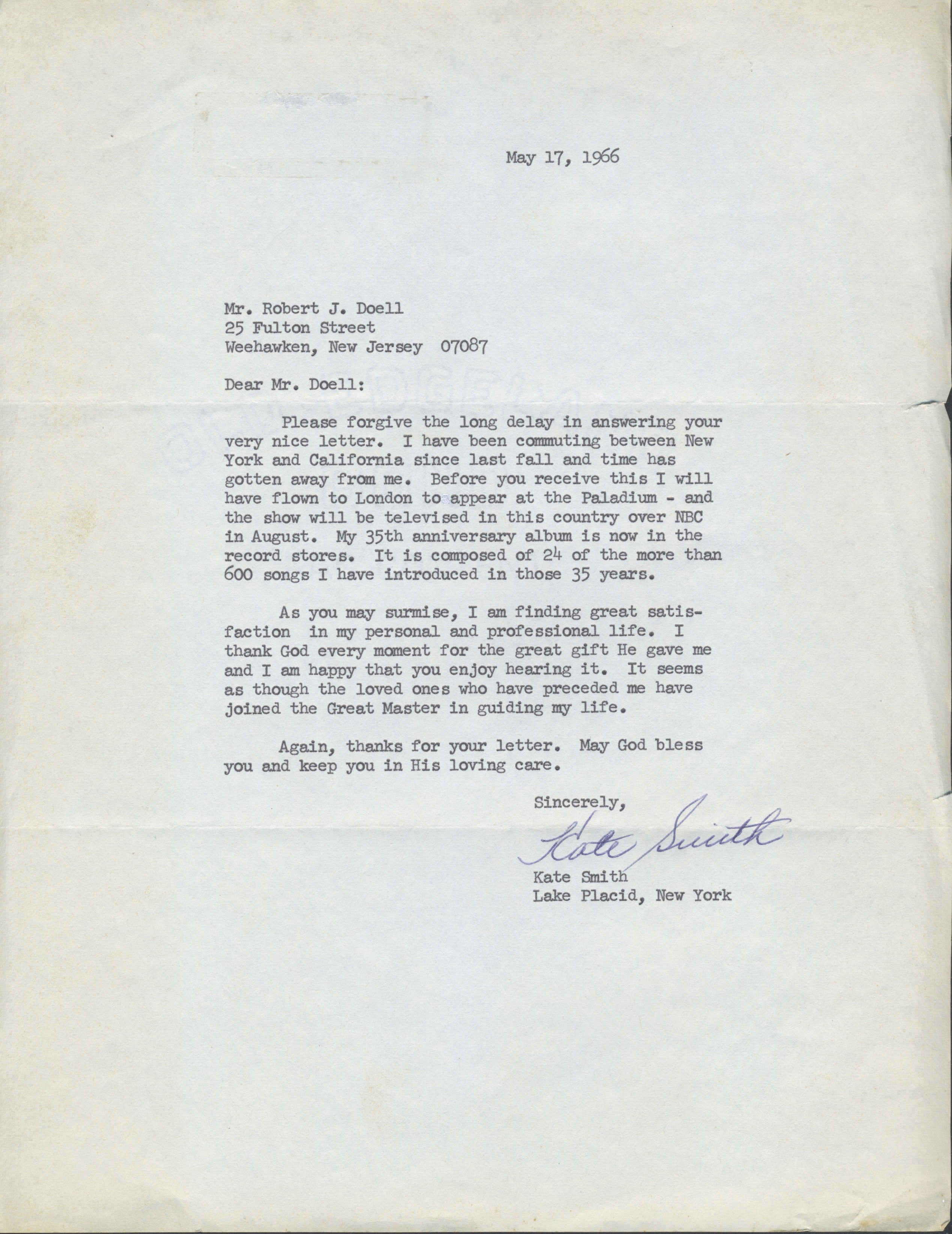 Typed letter signed from the popular singer, best known for her rendition of Irving Berlin's "God Bless America." May 17, 1966. Smith reports on her busy schedule and writes that she is "finding great satisfaction in my personal and professional life." Smith had converted to Catholicism in 1965. Folding creases with one slight edge tear at the right; overall in fine condition. 8.5 x 11 inches (21.7 x 28 cm).