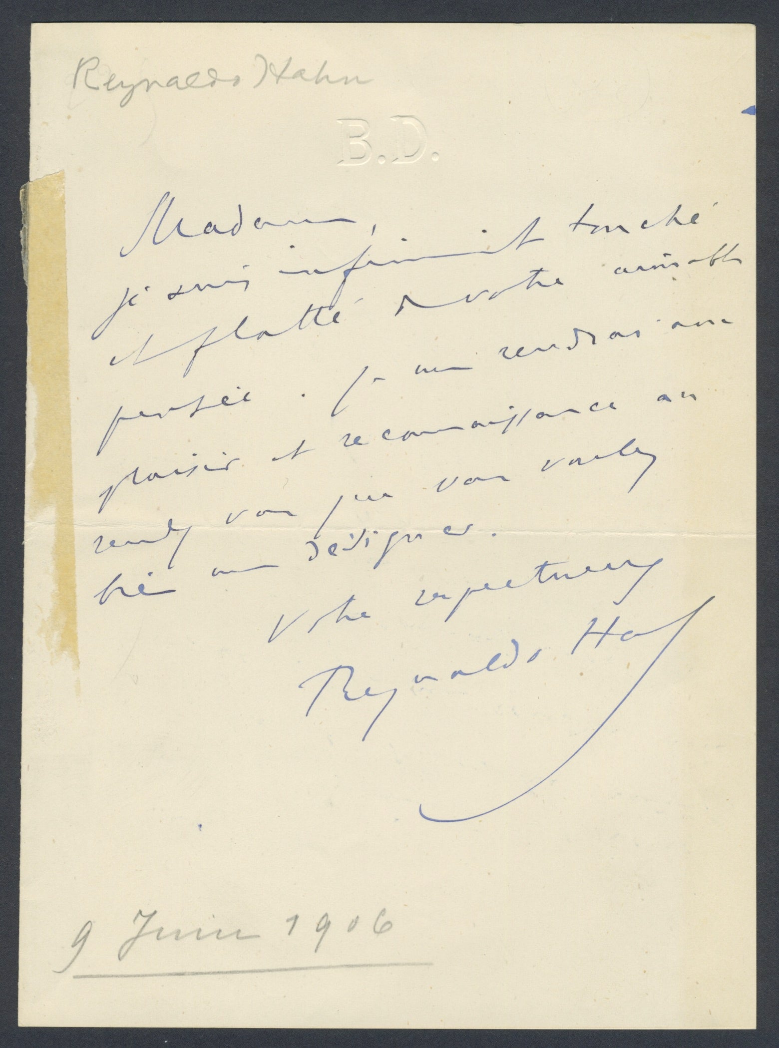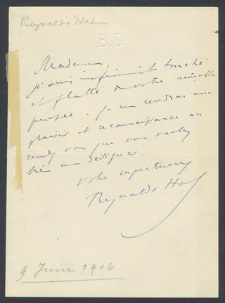 Autograph letter from the Venezuelan-French composer, conductor, critic and singer known for his mélodies, agreeing to attend a gathering given in his honor. Translated from the French, in full: "Madame, I am extremely touched and flattered by your kind thought. I will come with great pleasure to the gathering which you wish to dedicate to me. Respectfully, Reynaldo Hahn." Dated in pencil in another hand at the foot: June 9, 1906. On letterhead embossed with the initials B. D. 1 p. of a bifolium. Tape remnant to the left edge and some mounting remnants to the interior fold; otherwise in fine condition 5 x 6.75 inches (12.5 x 17 cm).