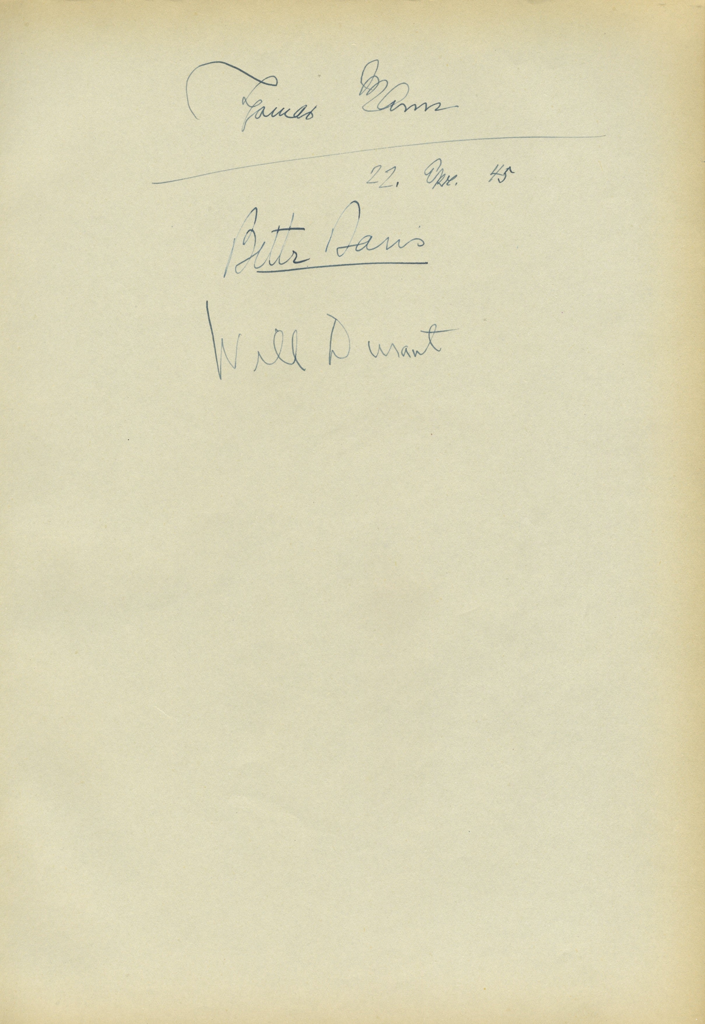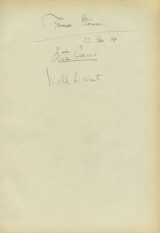 An unusual group of autograph signatures from the important German novelist, the great American actress, and the writer and historian Will Durant, signed together on an album leaf, with Mann dating April 22, 1945. It must have been a fascinating gathering at which these three met! Light overall toning, otherwise fine. 8 x 12 inches (21 x 31 cm).
