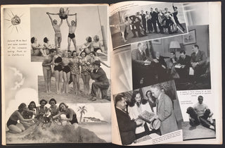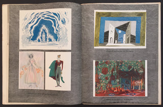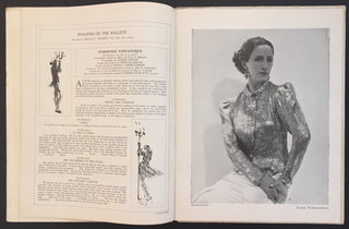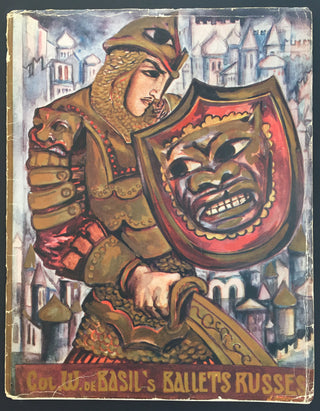 Original souvenir program from the 4th American season (1936–37) of Col. W. de Basil's Ballets Russes de Monte-Carlo, featuring a striking color cover illustration of a knight by Natalia Gontcharova. The contents include photographs of stars and conductors including Leonine Massine, Lubov Tchernicheva, David Lichine, Antal Dorati, Efrem Kurts, and others; an 8-page color section with costume and set designs by Gontcharova, Cecil Beaton, Picasso, Leon Bakst, Raoul Dufy, and others; and a final 3-page section showing the dancers on tour—building sandcastles and engaging in various other more frivolous forms of entertainment. 64 pp. Wrapper detached from the block; edge wear to the cover; internally fine and overall in very good condition. 9.75 x 12.25 inches (24.5 x 31 cm).