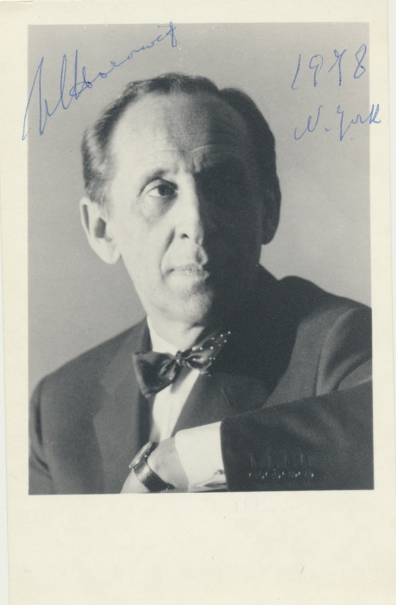 Signed photograph of the beloved pianist, who is shown in a small bust portrait and has signed at the head, dating "1978 / N. York." Stamped on the verso: May 16, 1978. Very fine. 3.5 x 5.5 inches (9 x 14 cm.)
