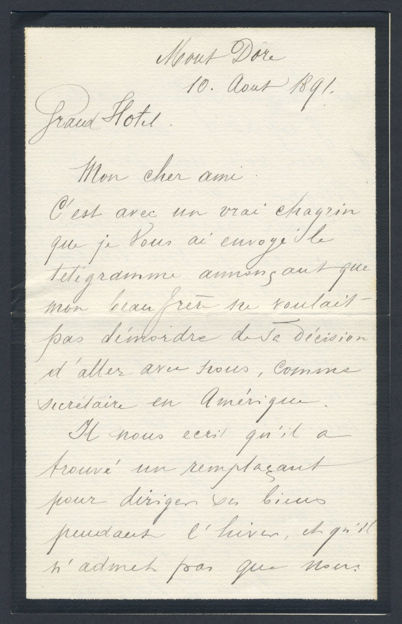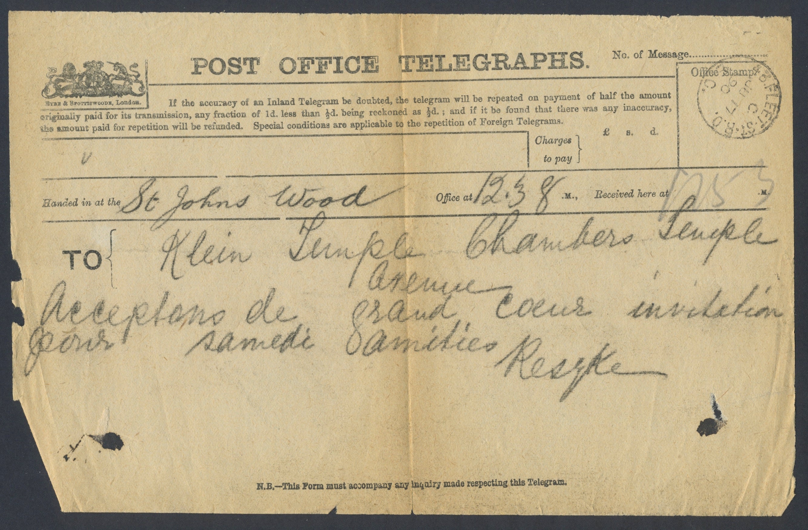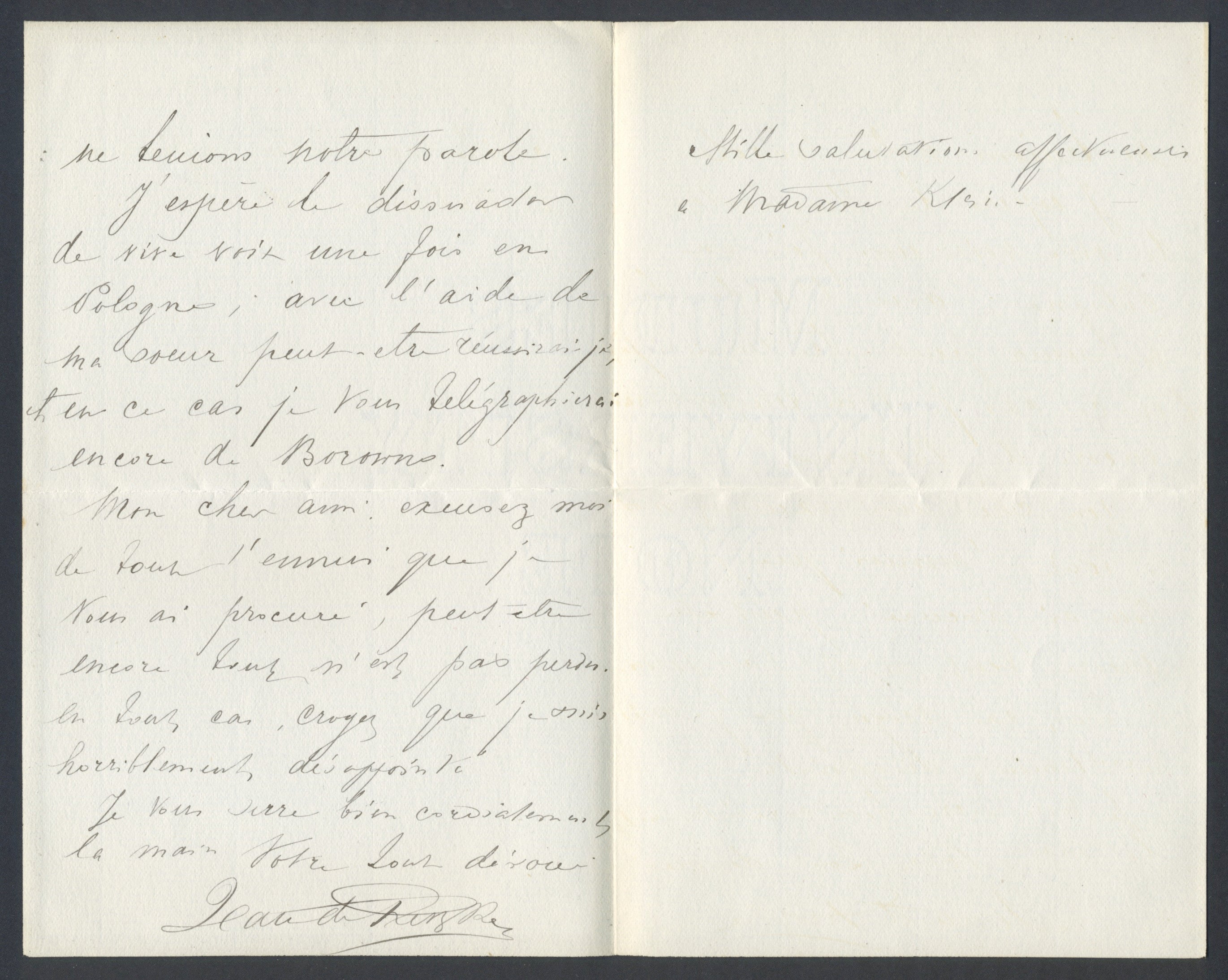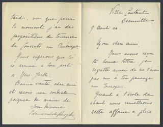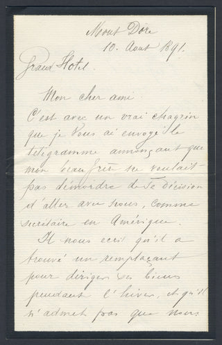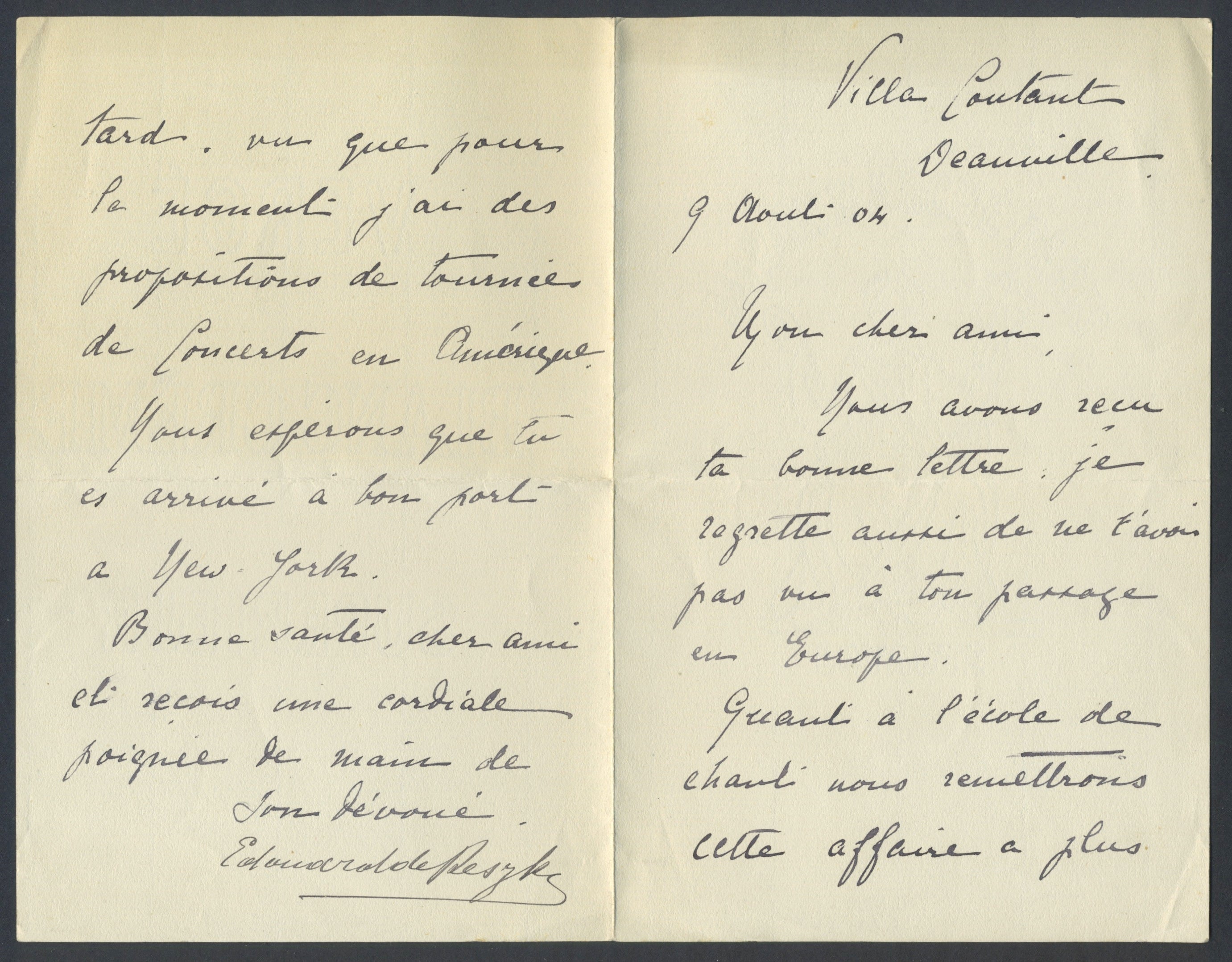 A group of two autograph letters and an original telegram from the Polish opera singer brothers, a bass and tenor who were among the most illustrious opera stars of the late nineteenth century, to the English singer, pedagogue, and critic Herman Klein. The first letter (August 10, 1891; 3 pp. on a black-bordered bifolium) concerns plans for the De Reszke's tour of the United States: Jean de Reszke writes that he is "horribly disappointed" to inform Klein that: "my brother-in-law [banker Leopold Julian Kronenberg] does not want to go back on his decision to travel with us to America as our secretary. He writes that he has found a replacement to direct his assets during the winter, and that he will not allow us to go back on our word." The second letter (August 9, 1904; 2 pp.), from Edouard de Reszke, thanks Klein for his letter and promises that "as regards the singing method, we will put off this matter until later, since at the moment I have tour offers for concerts in America." The original telegram, signed "Reszke," (July 17, 1890) accepts an invitation from Klein. Telegram heavily toned with some edge wear; letters overall in fine condition, 4.5 x 7 inches (11.3 x 17.7 cm).