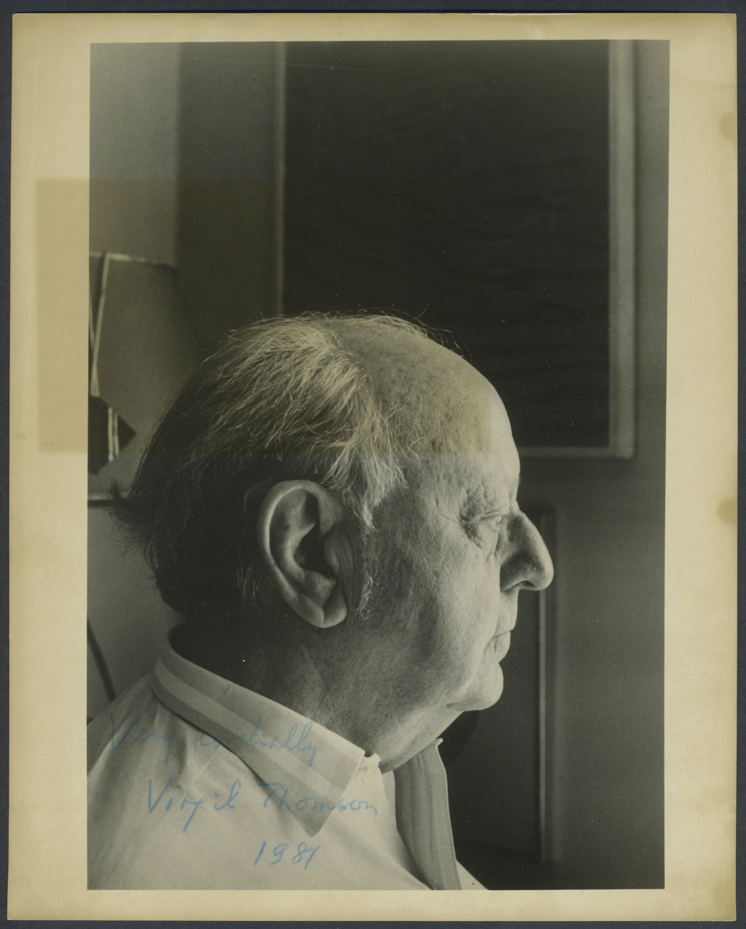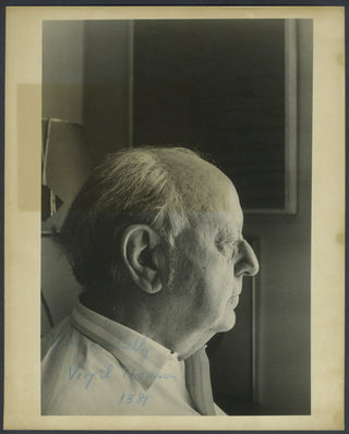 Signed photograph of the important twentieth-century composer, who is shown in profile by a window and has signed in blue at the foot: "Very cordially / Virgil Thomson / 1981." Photographed by Thomas Victor of New York. Slightly poor contrast to the inscription and some toning to the border of the photo, but overall in fine condition. 8 x 10 inches (20.5 x 25.5 cm).