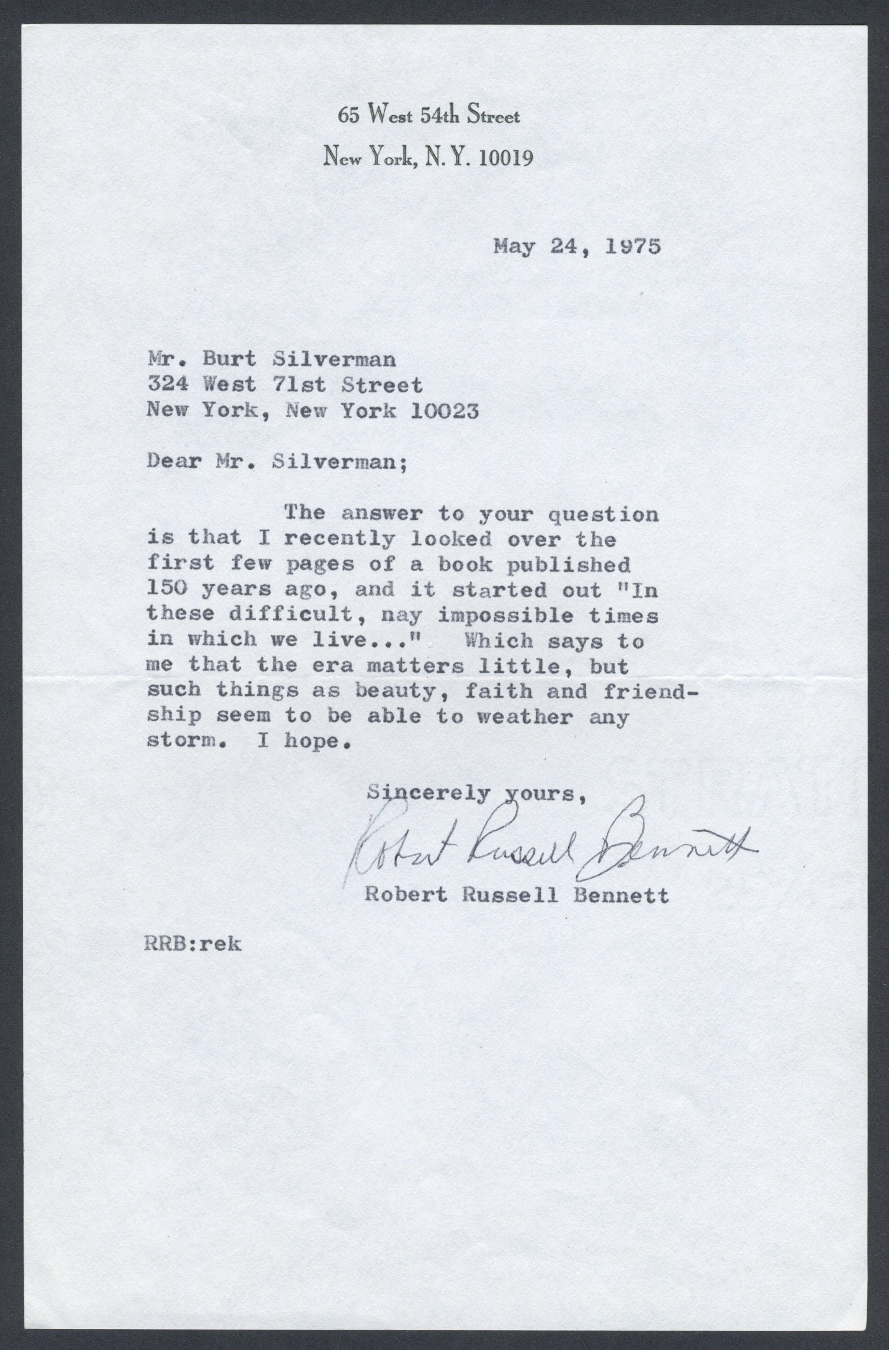 A touching typed letter signed from the most important orchestrator in Broadway history, arranger for Jerome Kern, Richard Rodgers, and George Gershwin, and himself a notable composer. May 24, 1975. To a Mr. Burt Silverman, Bennett writes: "The answer to your question is that I recently looked over the first few pages of a book published 150 years ago, and it started out 'In these difficult, nay impossible times in which we live...' Which says to me that the era matters little, but such things as beauty, faith and friendship seem to be able to weather any storm. I hope." In very fine condition. 5.5 x 8.5 inches (14 x 21.6 cm).