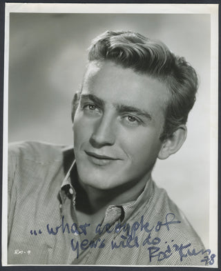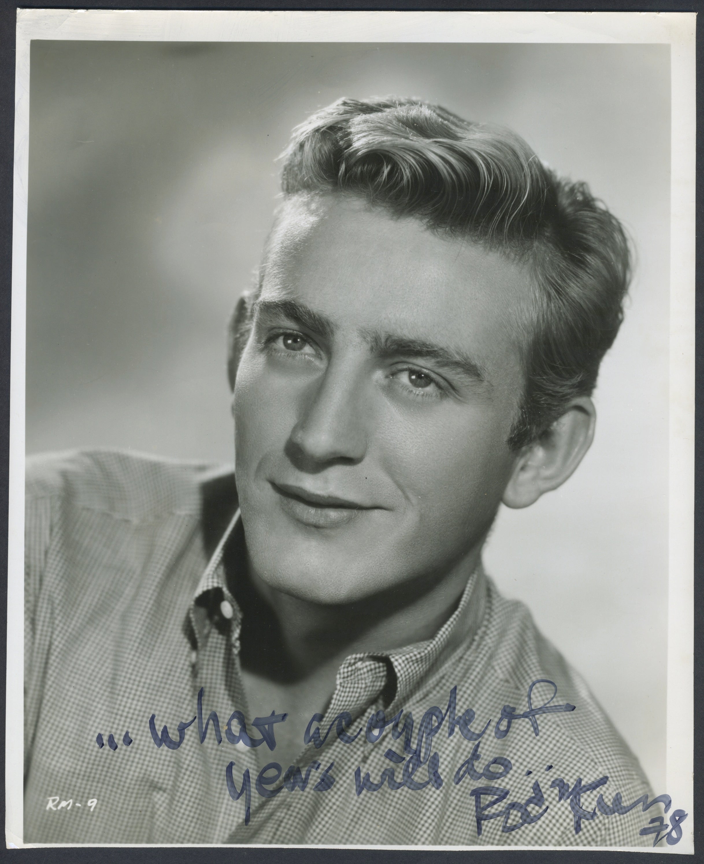Signed photograph of the American poet, singer-songwriter and actor. He is shown as a young man in a glossy studio portrait and has penned at the foot in black marker: "...what a couple of years will do... / Rod McKuen / 78." Some slight wrinkling; overall in fine condition. 8 x 9.5 inches (20.1 x 24.5 cm).