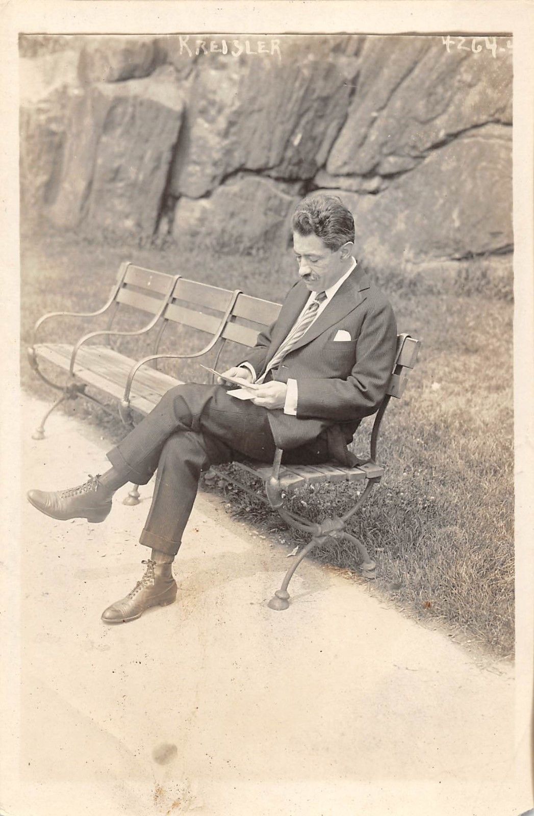 Two original photographs of the great violinist, shown enjoying a day out in Central Park, ca. 1914. One picture shows Kreisler reading on a bench, while in the other he is watching ducks beside a pond. Press stamps on the verso. One slightly irregularly trimmed with some corner wear; overall fine. 4 x 6 inches (10.1 x 15.5 cm) and 6 x 3.5 inches (15.1 x 9 cm).