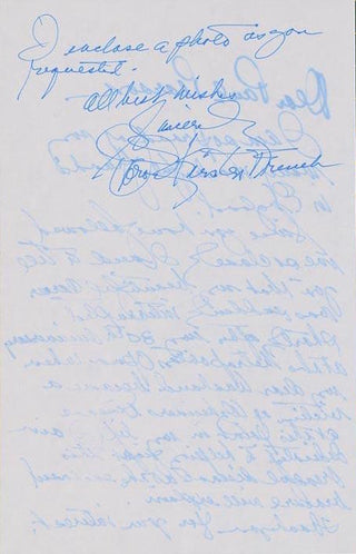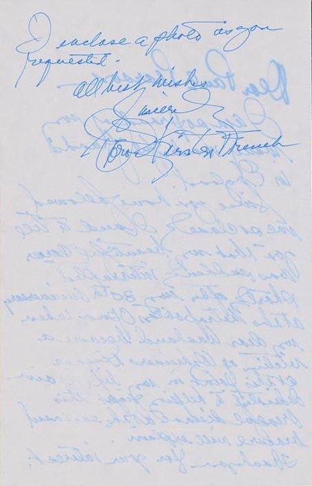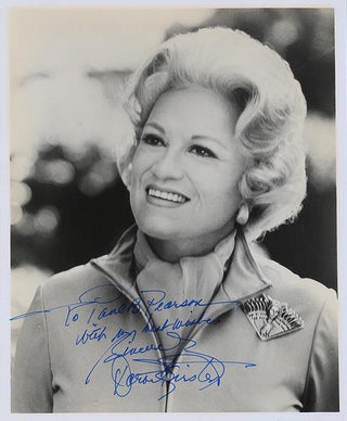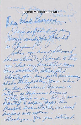 Kirsten, Dorothy. (1910–1992). Signed Photograph with Autograph Letter. Signed photograph of the American soprano who had an illustrious career at the Metropolitan Opera, together with an autograph letter sending the photograph and mentioning her husband, John French, and his fight with Alzheimer's disease. She is shown in the photograph smiling in a casual portrait, and has signed and inscribed at the foot. Letter reads, in part: "Since you have followed me so closely I need to tell you that my beautiful career was suddenly interrupted shortly after my 30th anniversary at the Metropolitan Opera when my dear husband became a victim of Alzheimer's disease. At this point in my life I am dedicated to helping fight this dreadful disease as the enclosed brochure will explain." Glossy black and white photograph signed in blue ink; letter 2 pp. on her letterhead with some bleed-through; overall very fine. Photograph 8 x 10 inches (20.3 x 25.3 cm); letter 5.5 x 8.5 inches (14 x 21.6 cm).