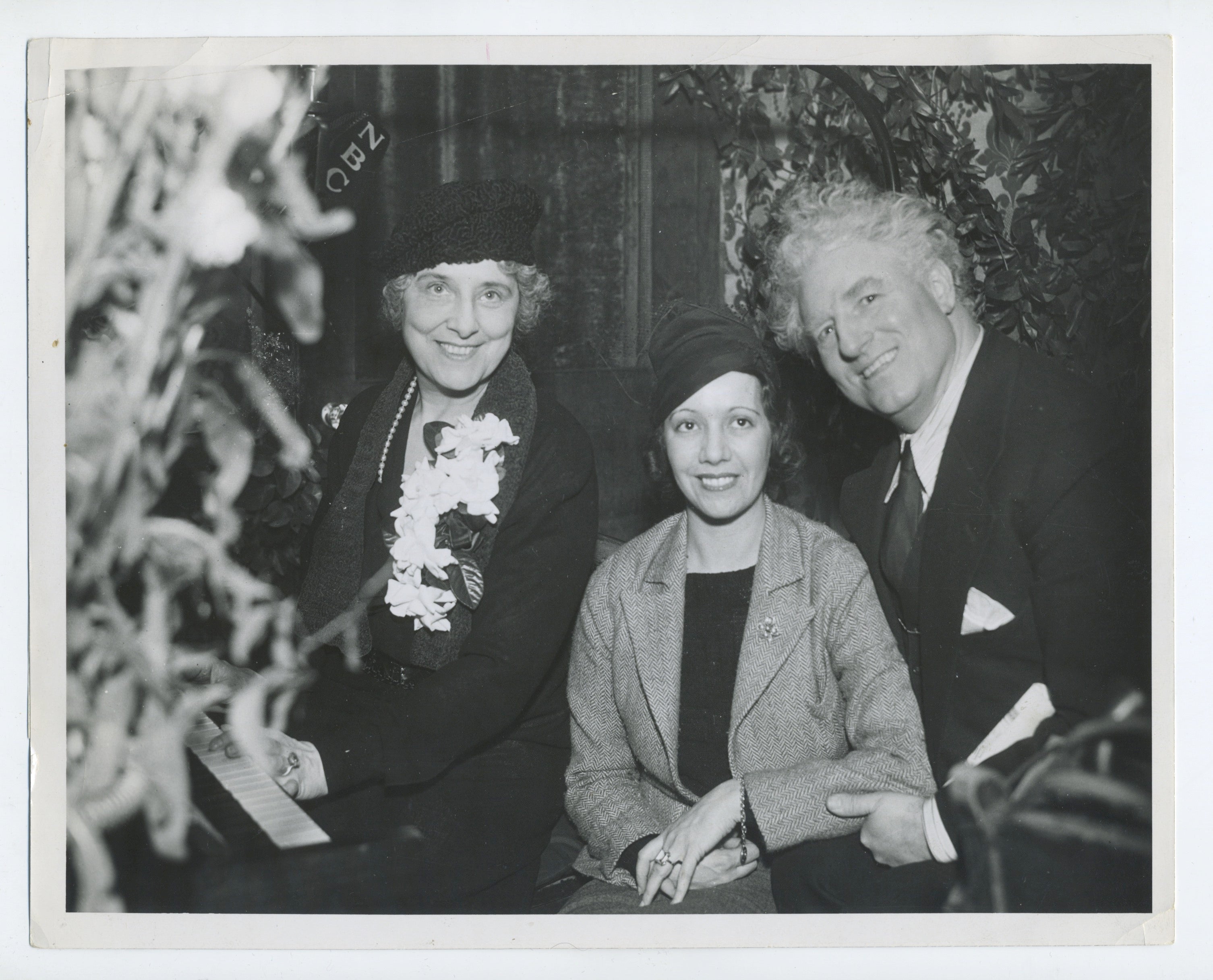 Original photograph dated 2/25/35 on the verso with a typed news description: "Geraldine Farrar, former Metropolitan Opera prima donna who has returned to the famous opera house to act as radio raconteuse at the Saturday afternoon broadcasts of Metropolitan Opera...found her Grand Tier box decorated with flowers in honor of her birthday when she arrived for her broadcast the other afternoon. Lily Pons and Giovanni Martinelli...were only two of dozens of friends and admirers who visited the microphone equipped Grand Tier box to felicitate the famous singer and radio commentator." Some creases at top left, small tear to lower right corner, else fine. 8 x 10 inch (20 x 25 cm).