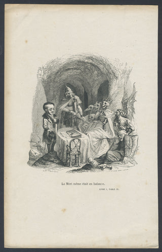 Original engraving depicting a scene from Jean-Pierre Claris de Florian's Fables ("La Mort," no. IX of his Livre I). Death, shown as a skeleton with a crown, deliberates over which of her servants to make prime minister: War, Gout, or Fever. Engraved by Andrew Best Leloir (French, 19th century.) Toning and some light foxing, diagonal crease, overall very good. 5.75 x 9 inches (14.6 x 23.2 cm).