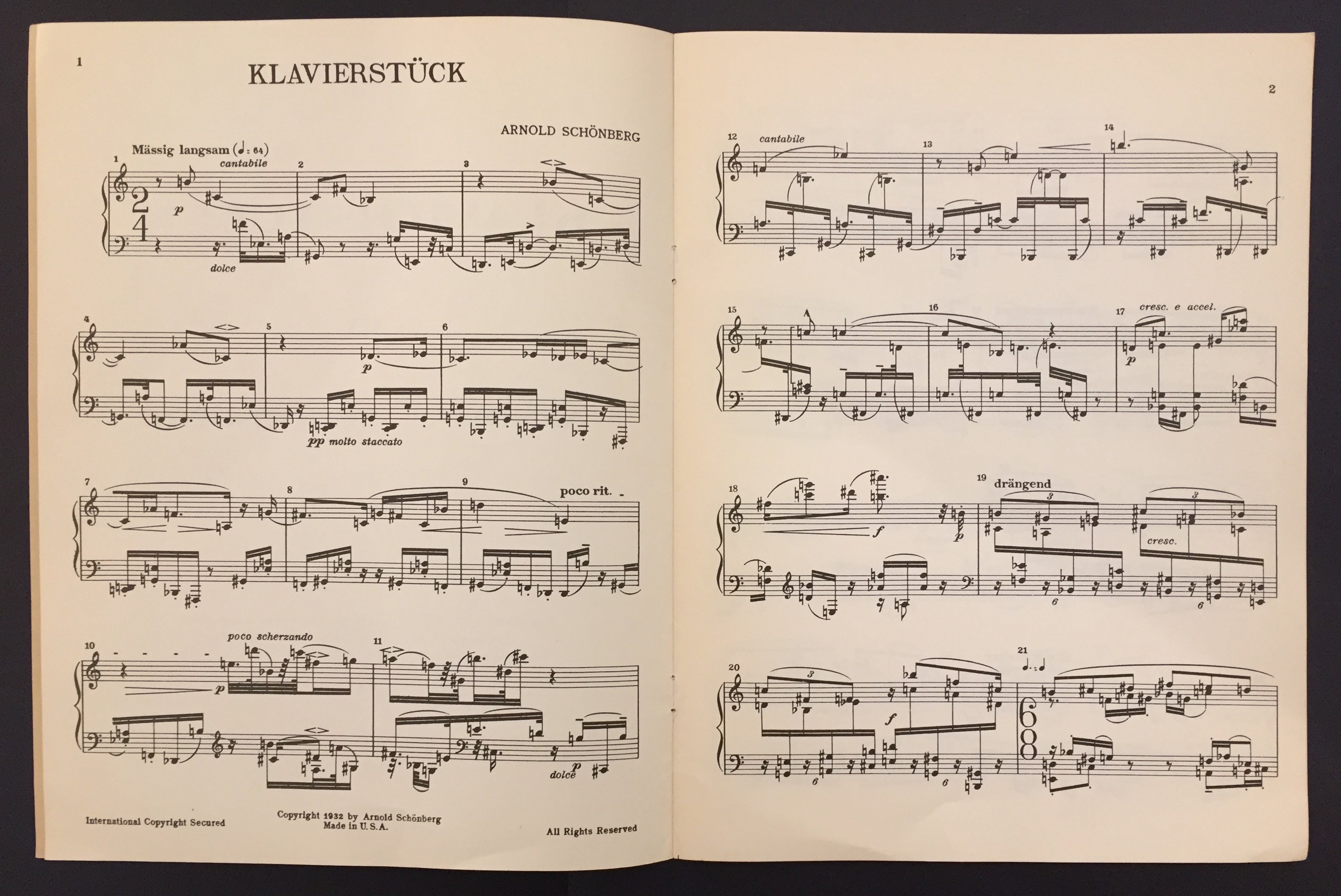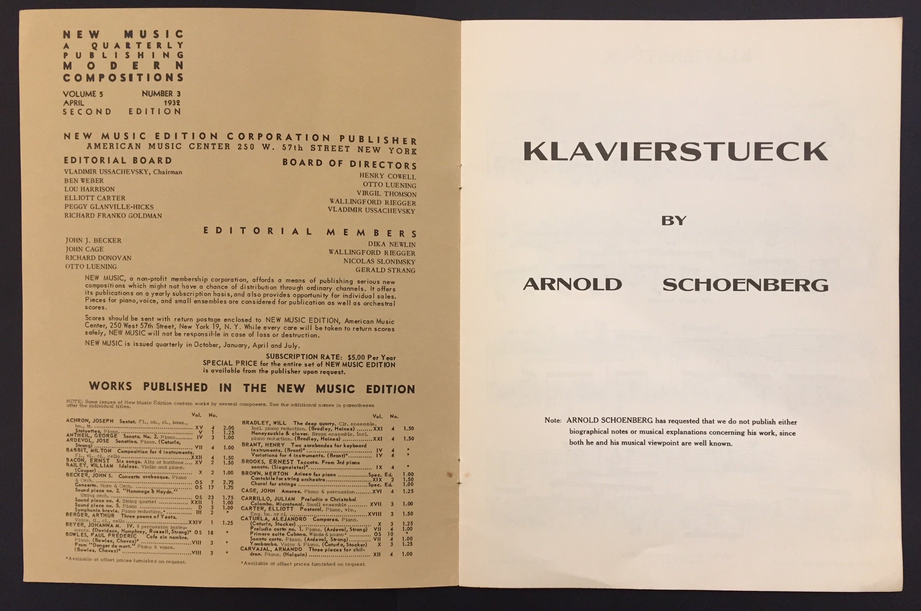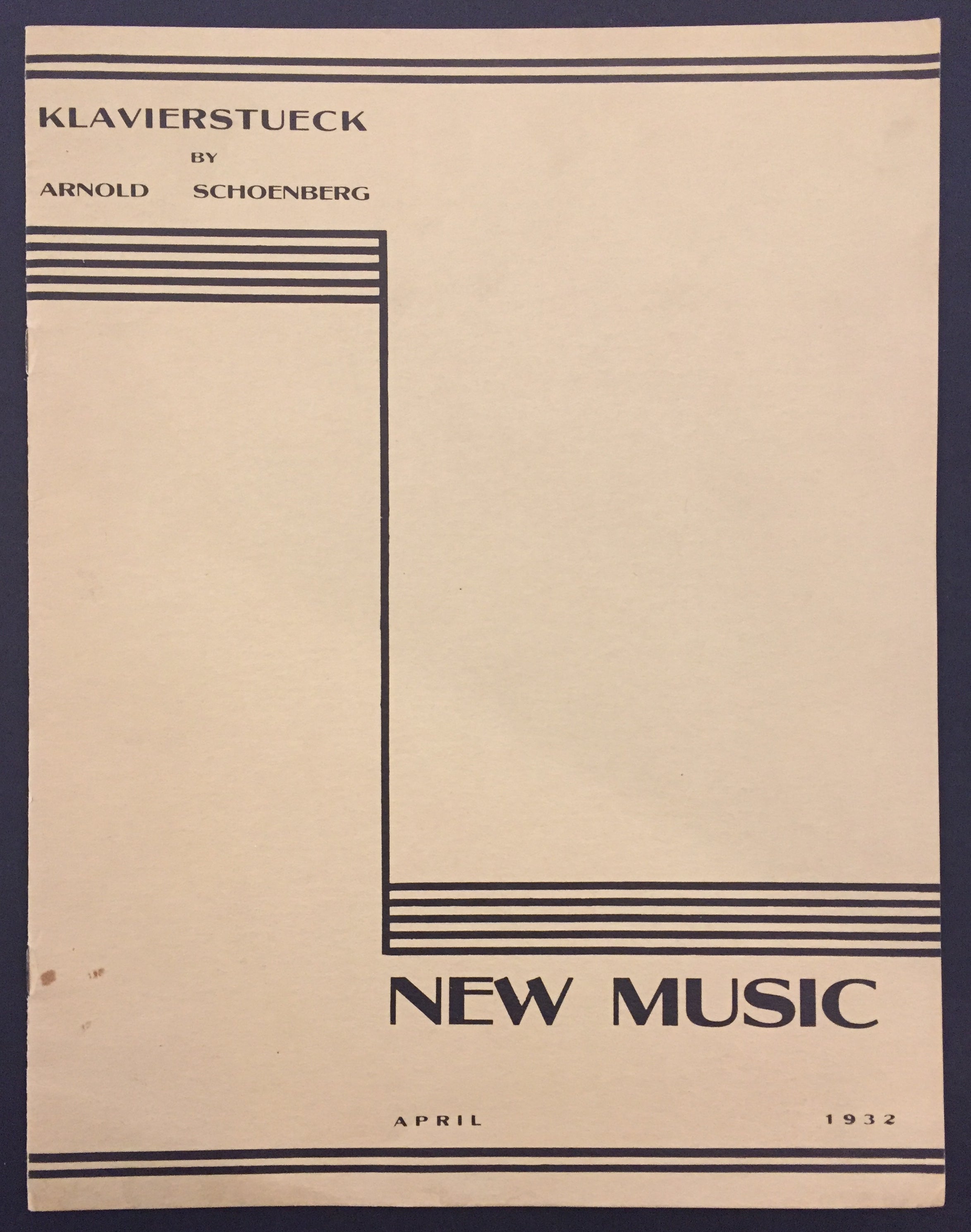 Schoenberg, Arnold. (1874–1951). Klavierstück [op. 33b]. New York: New Music Edition Corporation Publisher. 1932. Second edition of Schoenberg's Klavierstück, later published as no. 2 of his Klavierstücke op. 33. Published in the series "New Music: A Quarterly Publishing Modern Compositions," vol. 5, no. 3. 7 pp. In fine condition. 8.5 x 11 inches.