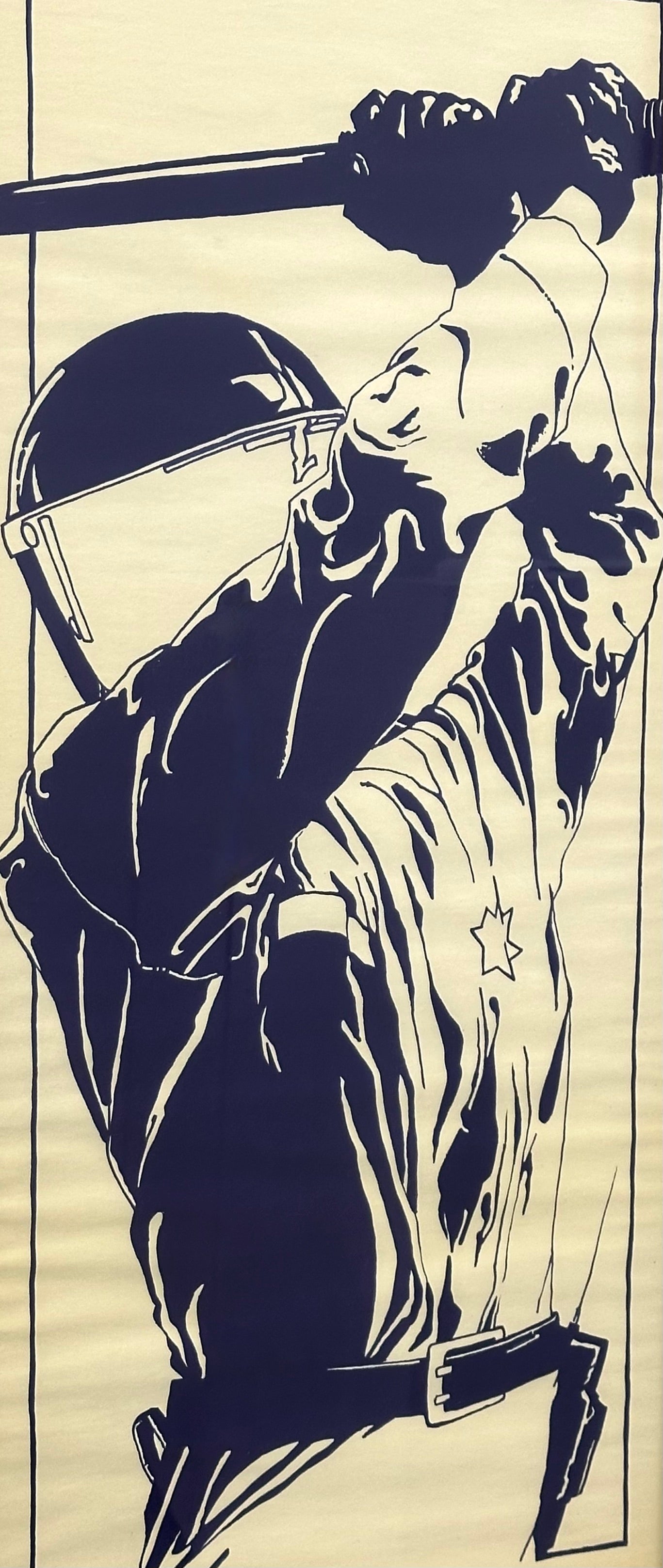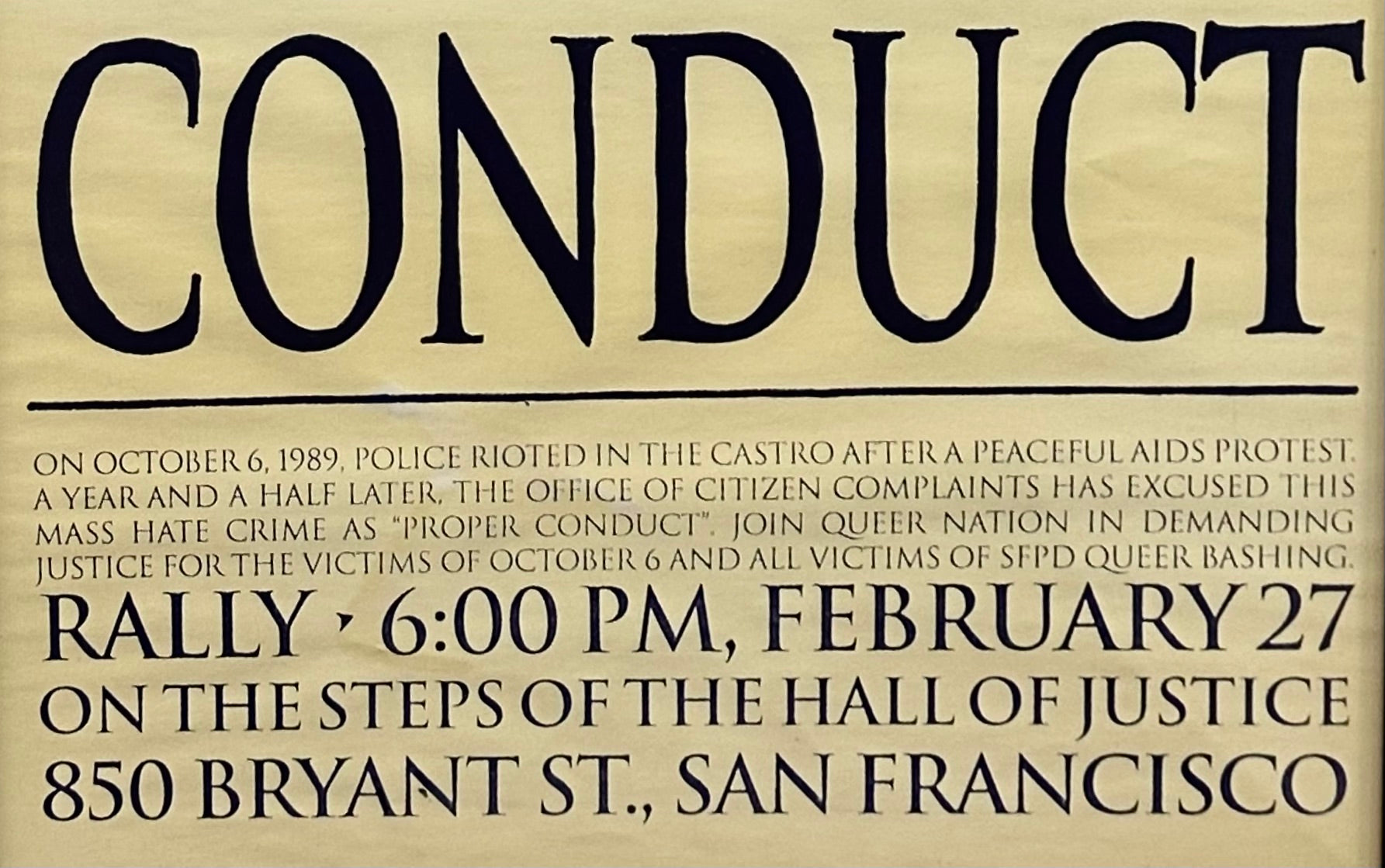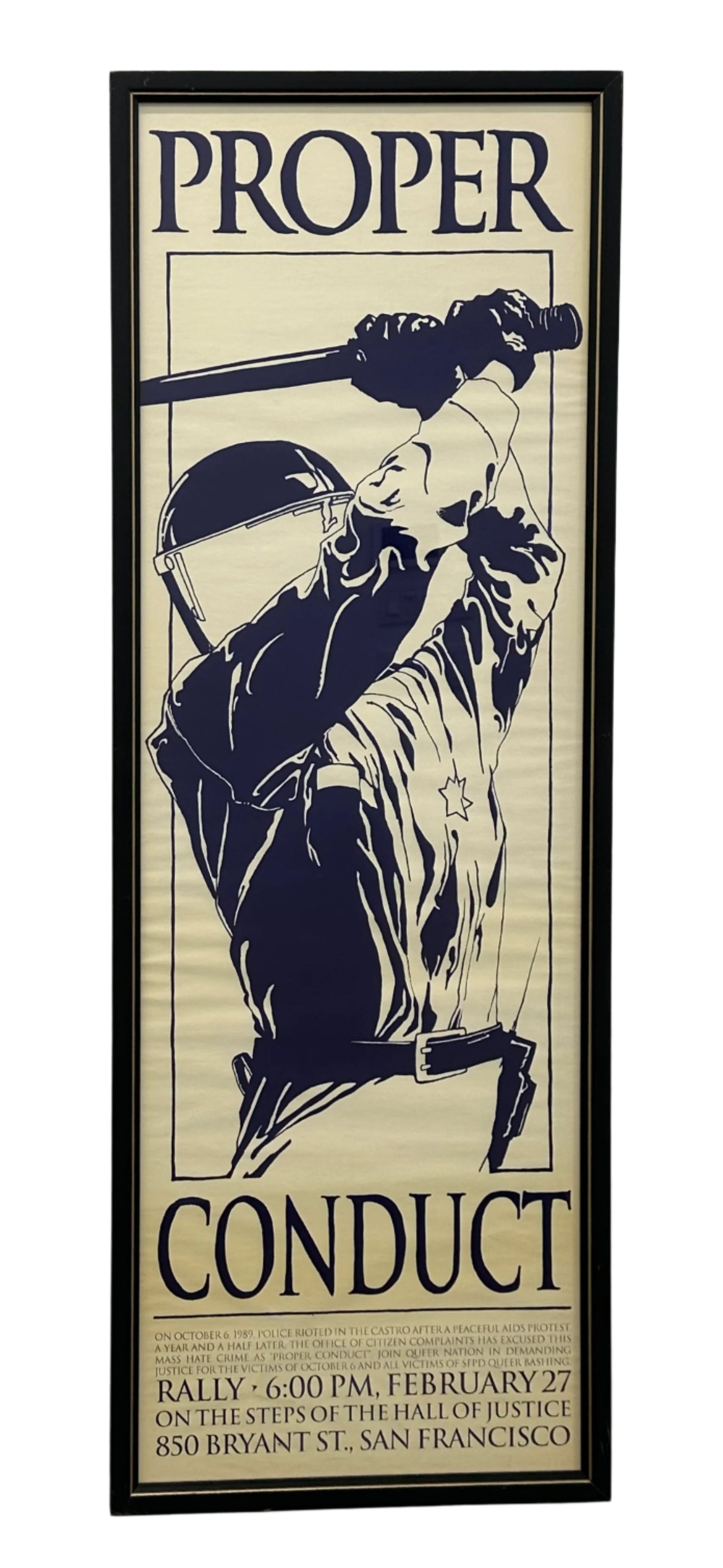 Original poster for a protest organized by Queer Nation in San Francisco to demand justice for victims of the 1989 Castro Sweep Police Riot, when more than 200 San Francisco police officers reacted to an ACT UP march by invading the gay Castro District, declaring the entire neighborhood an unlawful assembly and violently clearing the streets. The Queer Nation protest took place at the San Francisco Hall of Justice following a Police Commission finding that the police sweep of the Castro had constituted “proper conduct.” The poster was designed by gay Latino artist and activist Fernando Aguayo-Garcia and was produced in an extremely limited number of copies using the cyanotype process. First Printing. Bright and clean. Cyanotype poster. 12 × 35.5 inches. Near fine.