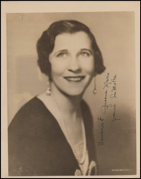 Mario, Queena. (1891-1951). Signed Photograph. From the renowned soprano who made her debut at the Metropolitan Opera in 1922 an was a star there for many years. 8 X 10 inches, some light spotting, else fine. Inscribed to the harpist, Yvonne La Mothe. Sold together with two 8X10 Ortho Print Mishkin photographs of the soprano in two roles. One of these photographs is of Mario in the 1931 Metropolitan production of Hansel und Gretel - the Met's first radio broadcast.