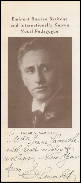 A signed advertising card, 10 X 23 cm., inscribed beneath the photo portion to harpist Yvonne La Mothe. On the verso, there is a typed note from Samoiloff thanking her for her note and saying that "if you really enjoyed my singing and speaking and you want to hear me again, a few lines from you and your friends to Captain Dobbs with a request for me, may bring me to his ship again soon." Apparently, the card was signed after a cruise ship performance. Very unusual.
