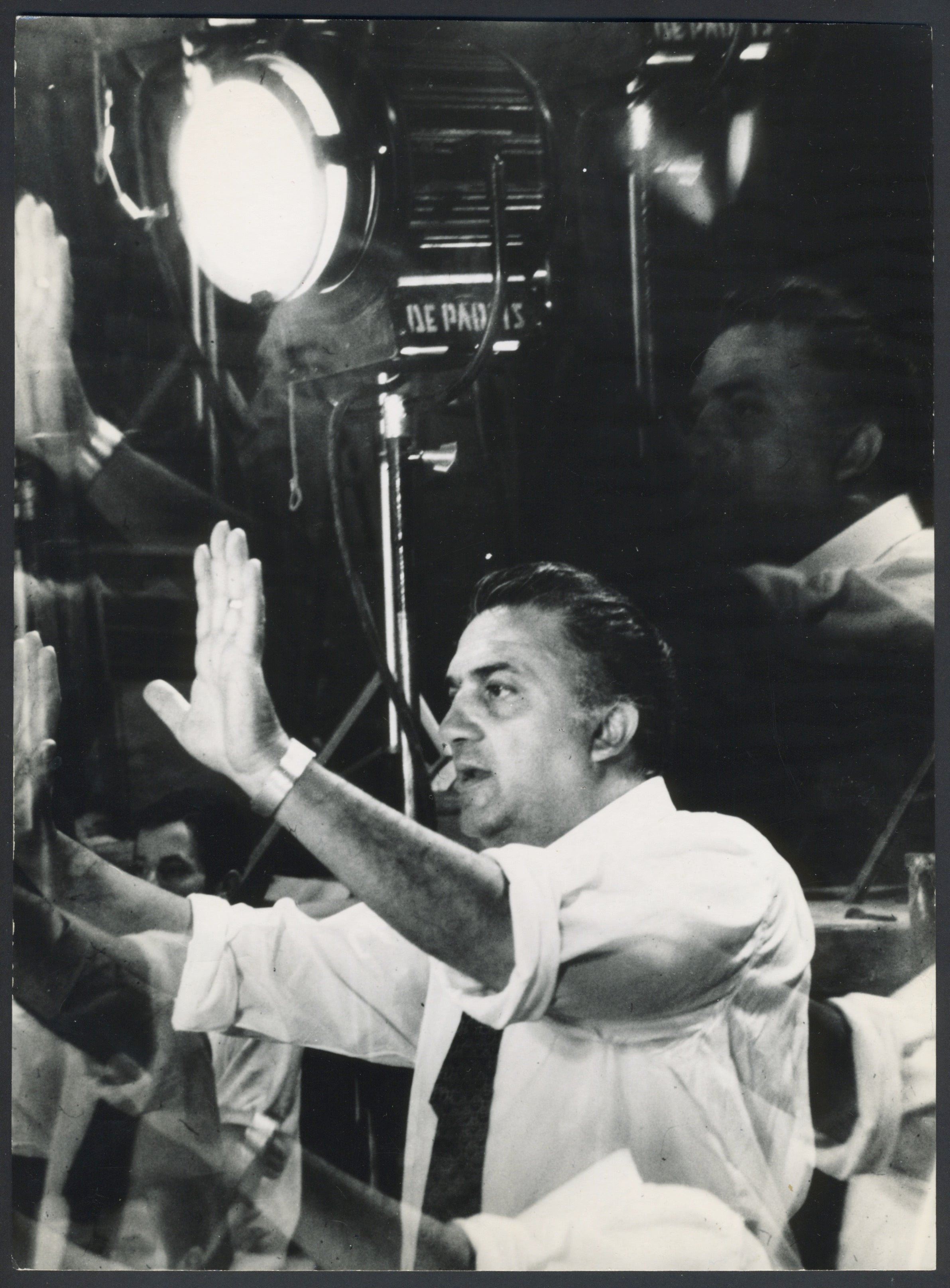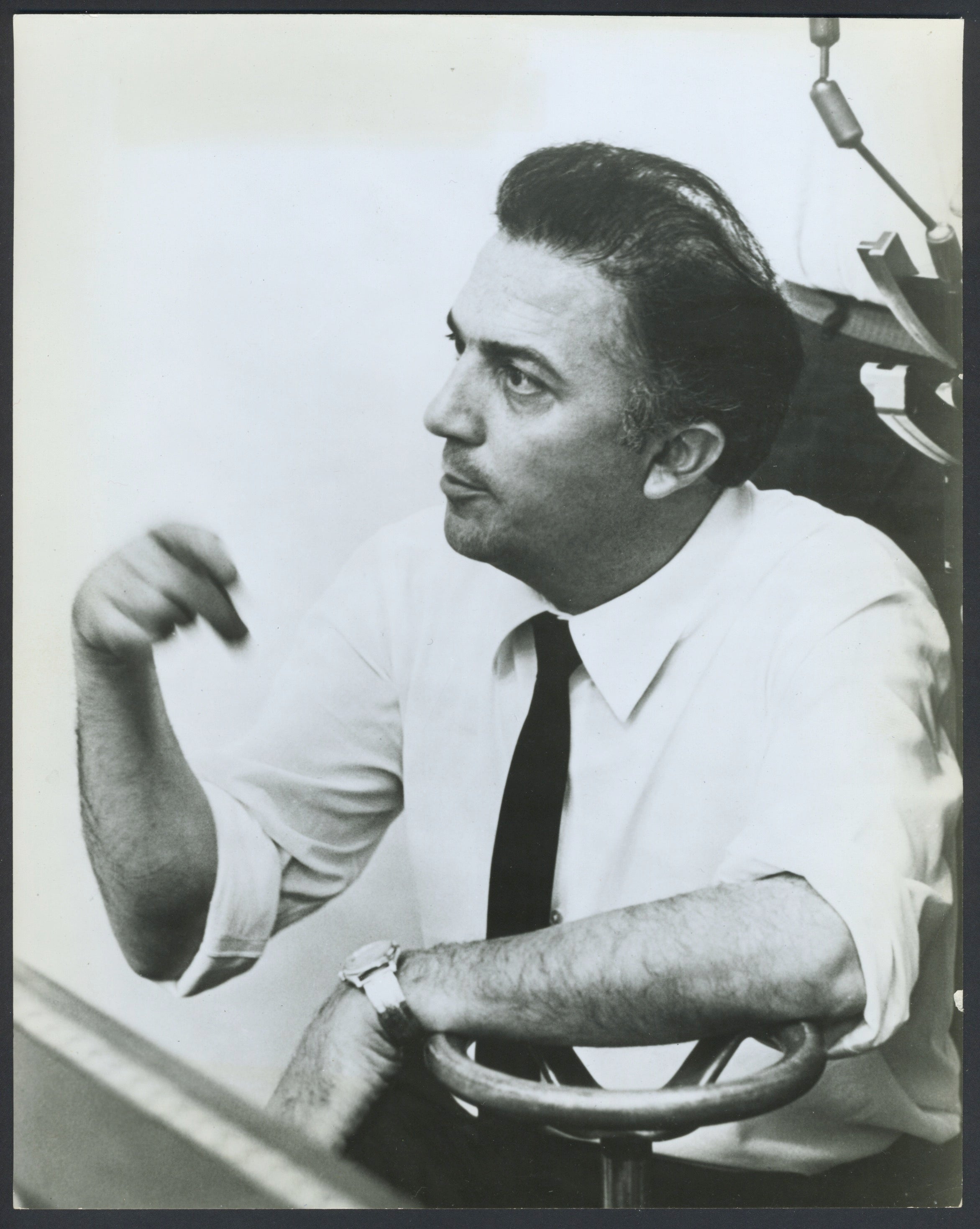 Two original photographs of the important Italian director at work on-set, ca. 1950's. Some light edge wear; overall fine. 7.75 x 10.5 inches (19.7 x 26.6 cm) and 7.5 x 9.5 inches (19.3 x 24.2 cm).