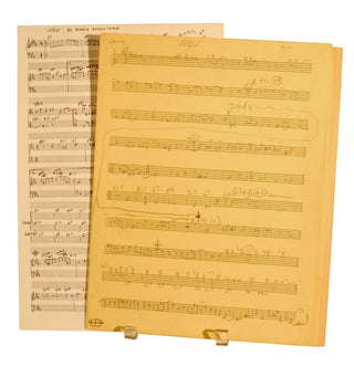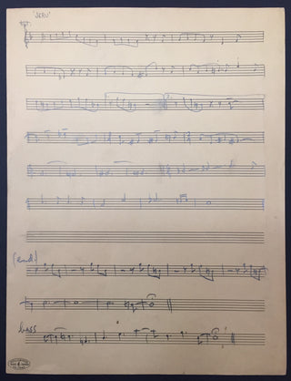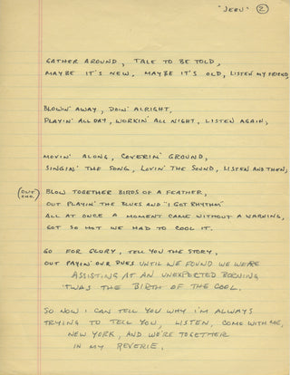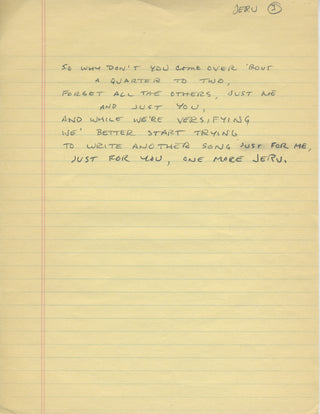 Gerry Mulligan's autograph lyrics for his song "Jeru," together with a group of handwritten instrumental parts to the song. The lyrics are written in pen and pencil over three sheets of lined 8.5 x 11 notepaper, with one strike-through in the same pen and one insertion in another hand. The parts included are labeled "Gerry," "Bass," "trpt," "Jeru Two," (16 measures apparently for trumpet, written on the opposite page to the trumpet part), and "Background for solos," each 1 p. in pencil on 9.5 x 12.5 and 8.5 x 11 manuscript paper. Also included is a facsimile of a lead sheet with melody and chords to the song, also apparently in Mulligan's hand. Instrumental parts with some smudges, pencil and pen corrections, and light signs of use; overall fine. Lyrics with toning, otherwise very fine.