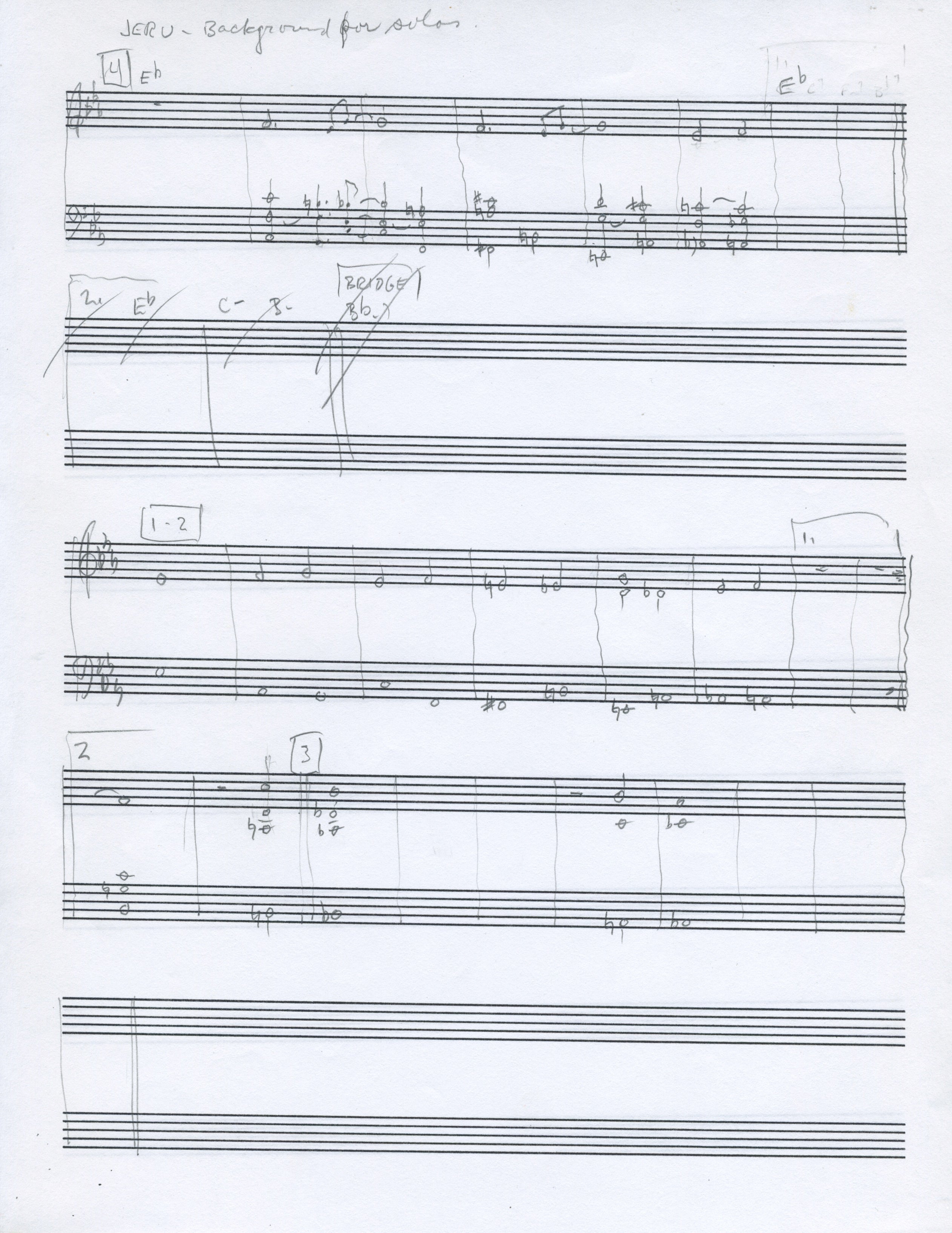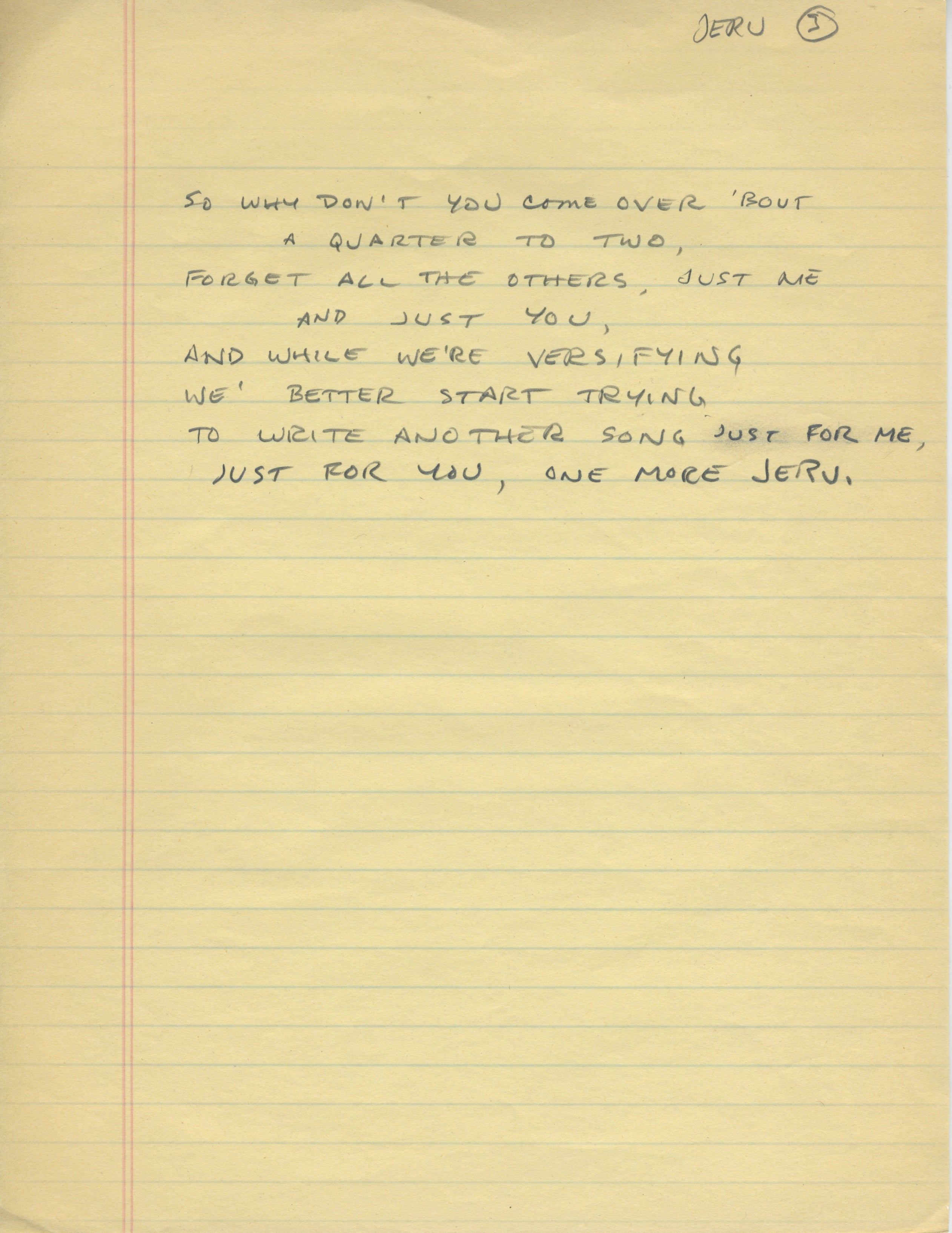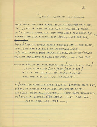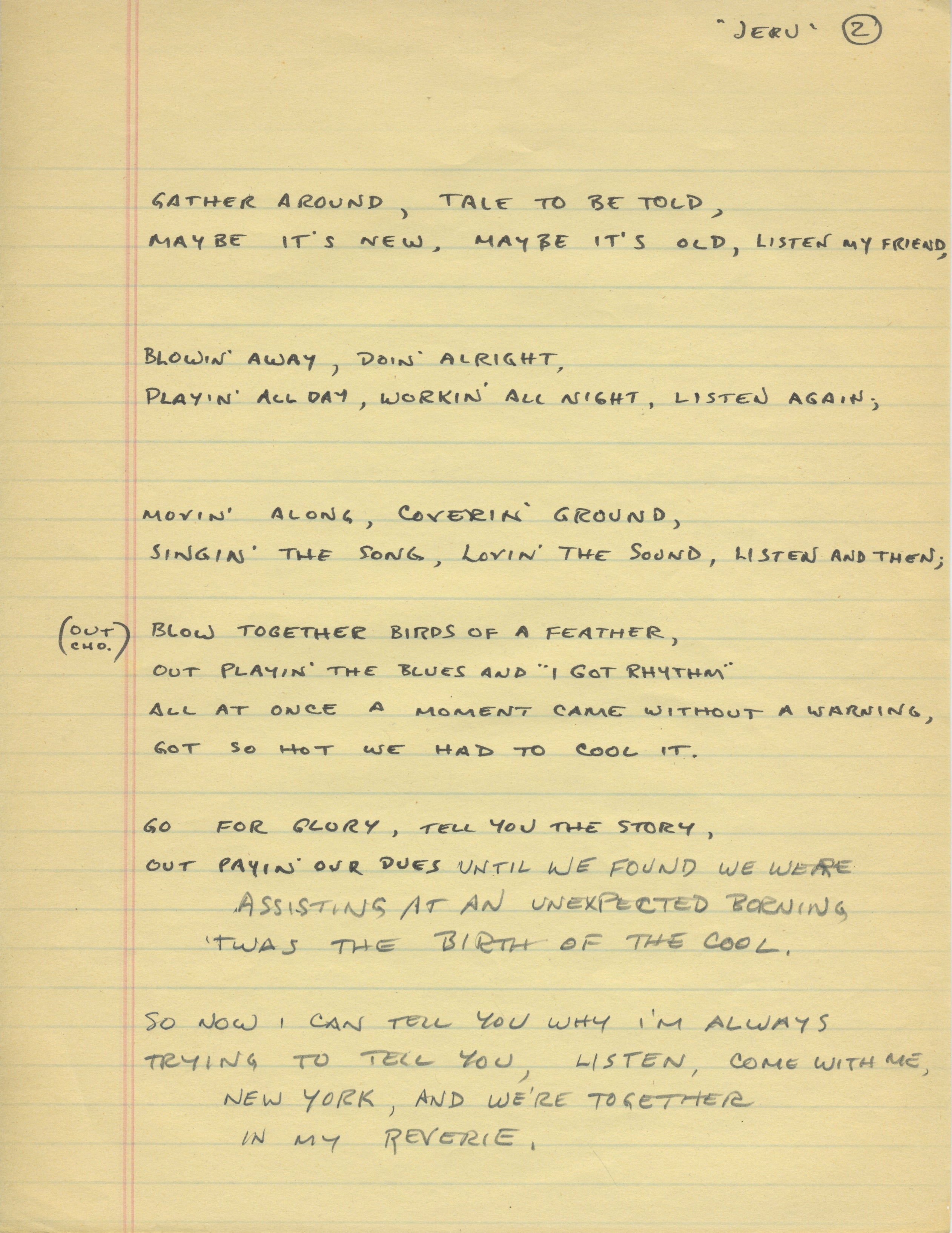 The song "Jeru," first recorded on Miles Davis' CD Birth of the Cool, is generally an instrumental number, and we have been unable to find any recordings using the present text. These clever and self-referential lyrics, with many internal rhymes ("Just for all the lovely people that you see in the road / We'll sing them a song in Jeruvian mode / If I can have a pref'rence, I'll even make ref'rence / to why you write a song like Jeru, just for you...") fit well to the song's upbeat opening lick, although they would require a highly agile singer to match the speed of the horns! The text to the bridge ("Then if you'd be kind enough to / tell me why you / write these ex- / ten- / ded / brid- / ges...") is trickier to match to the music, and the second and third pages of text fall out of sync with the structure of the song (as recorded on Birth of the Cool and Re-Birth of the Cool.) While it appears the lyrics were probably written after the song, we have not established whether they have ever been used in performance.