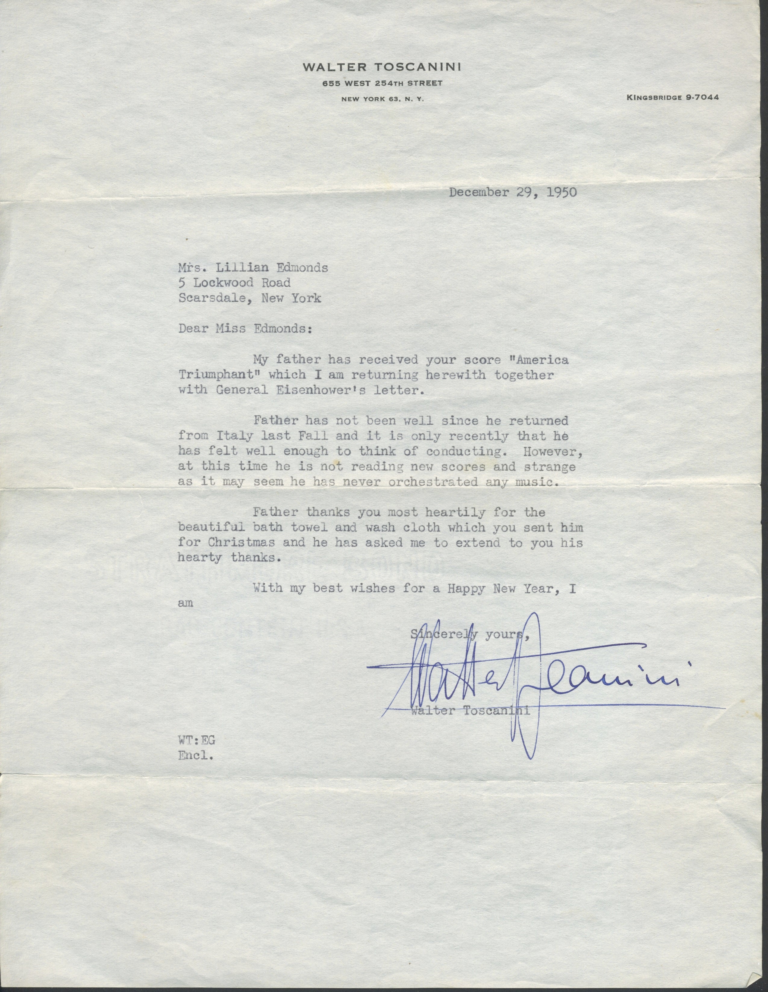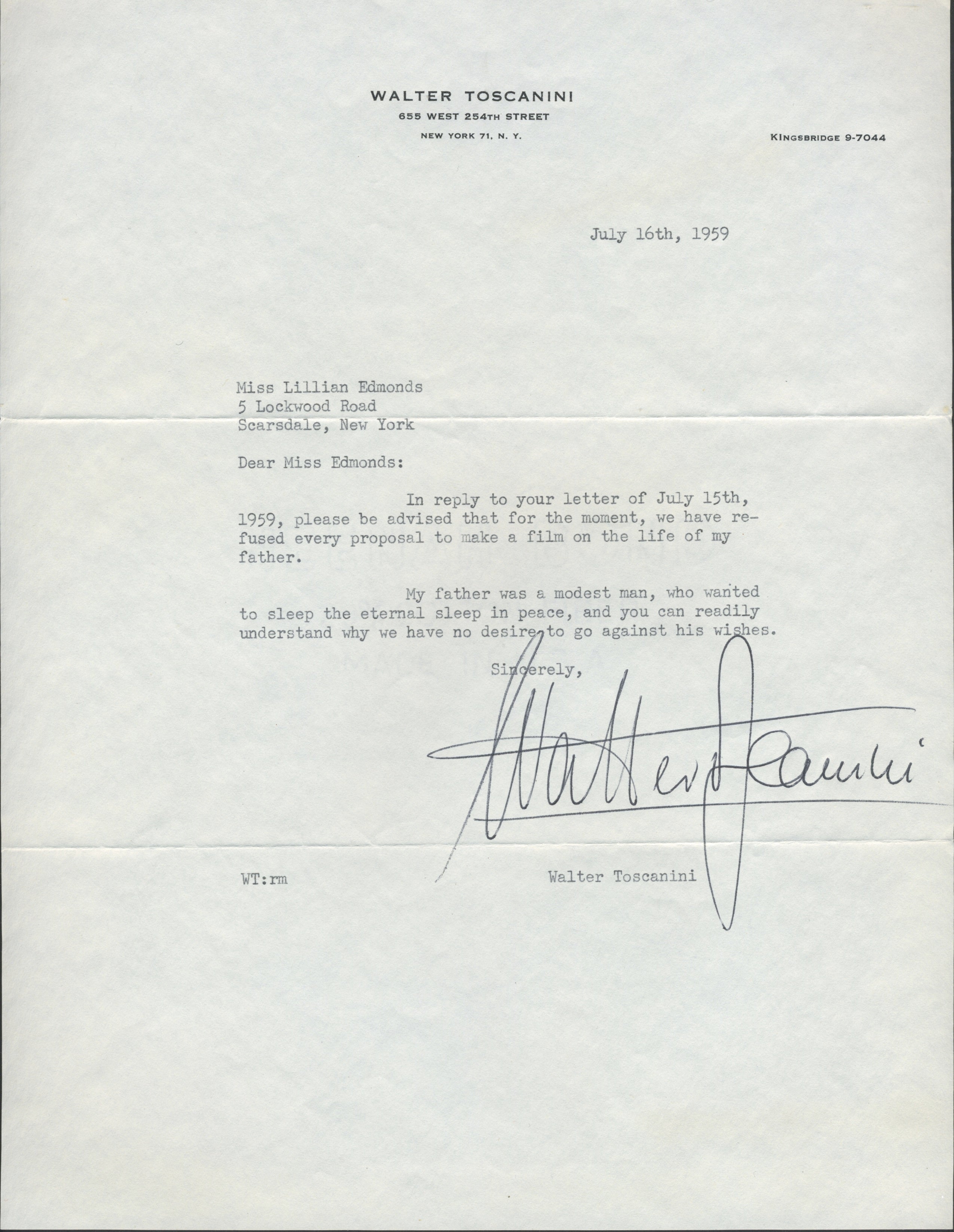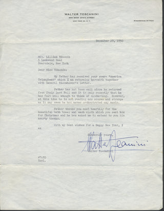 Two typed letters from Walter Toscanini, son of the great conductor, to a Lillian Edmonds. December 29, 1950 and July 16, 1959, each 1 p. In the first letter, Toscanini returns a score "together with General Eisenhower's letter" and regrets that his father "is not reading new scores and strange as it may seem he has never orchestrated any music," also thanking Edmonds for a Christmas gift. In the second letter, two years after Toscanini's death, his son advises Edmonds that "for the moment, we have refused every proposal to make a film on the life of my father. My father was a modest man, who wanted to sleep the eternal sleep in peace, and you can readily understand why we have no desire to go against his wishes." Folding creases; overall very fine, together with one original envelope. 8.5 x 11 inches (21.7 x 28 cm).