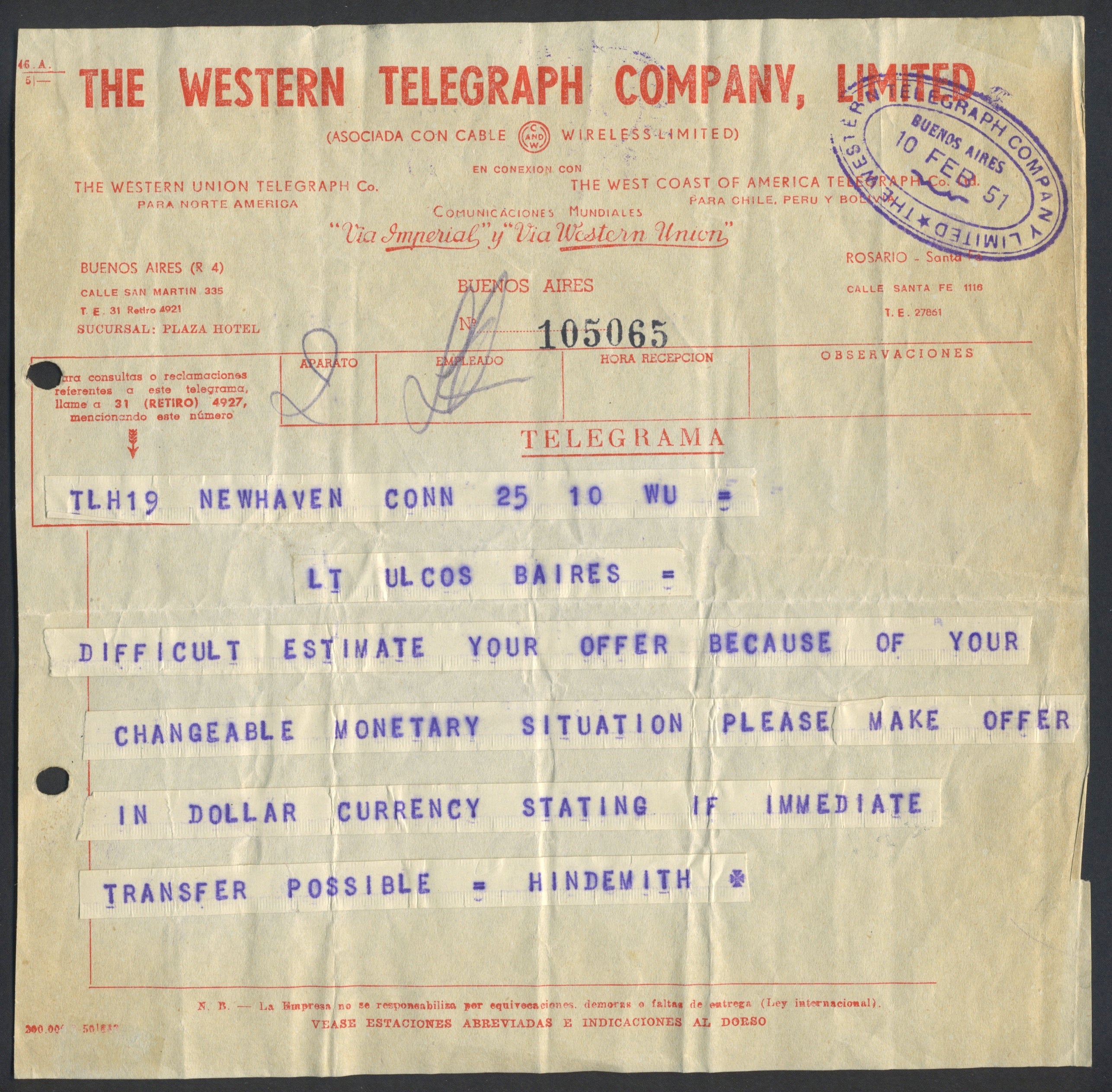 Hindemith, Paul. (1895–1963). Original Telegram. Original telegram from the important German composer, who cables from New Haven to Buenos Aires to the German-Argentinian concert promoter Geraldo Uhlfelder: "Difficult estimate your offer because of your changeable monetary situation. Please make offer in dollar currency stating if immediate transfer possible. Hindemith." Stamped at the upper right: Buenos Aires, February 10, 1951. Toning and light wear, overall fine. 8.25 x 8 inches (21 x 20.7 cm).