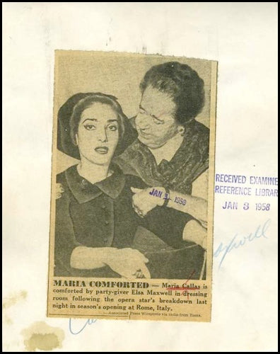 Callas, Maria. (1923–1977). Original Photograph after the 1958 Rome Walkout. The great soprano is shown being comforted by her longtime friend, Elsa Maxwell, following the famously abbreviated January 1958 Norma performance. Italy's president was in attendance for the opening night of the Rome Opera House, and though Callas had felt ill and warned the house to have a standby ready (they refused, and said "nobody can double Callas"), she agreed to go ahead with the performance. A bootleg recording of Act 1 survives and reveals Callas sounding ill. Feeling she could not complete the performance, she cancelled after the first act and was later visciously accused of walking out on the President. The press jumped all over her and turned the event into a major international news sensation where Callas was depicted as a temperamental and capricious diva. She sued the Rome Opera House and, 13 years later, they were found to be at fault for not providing an understudy.