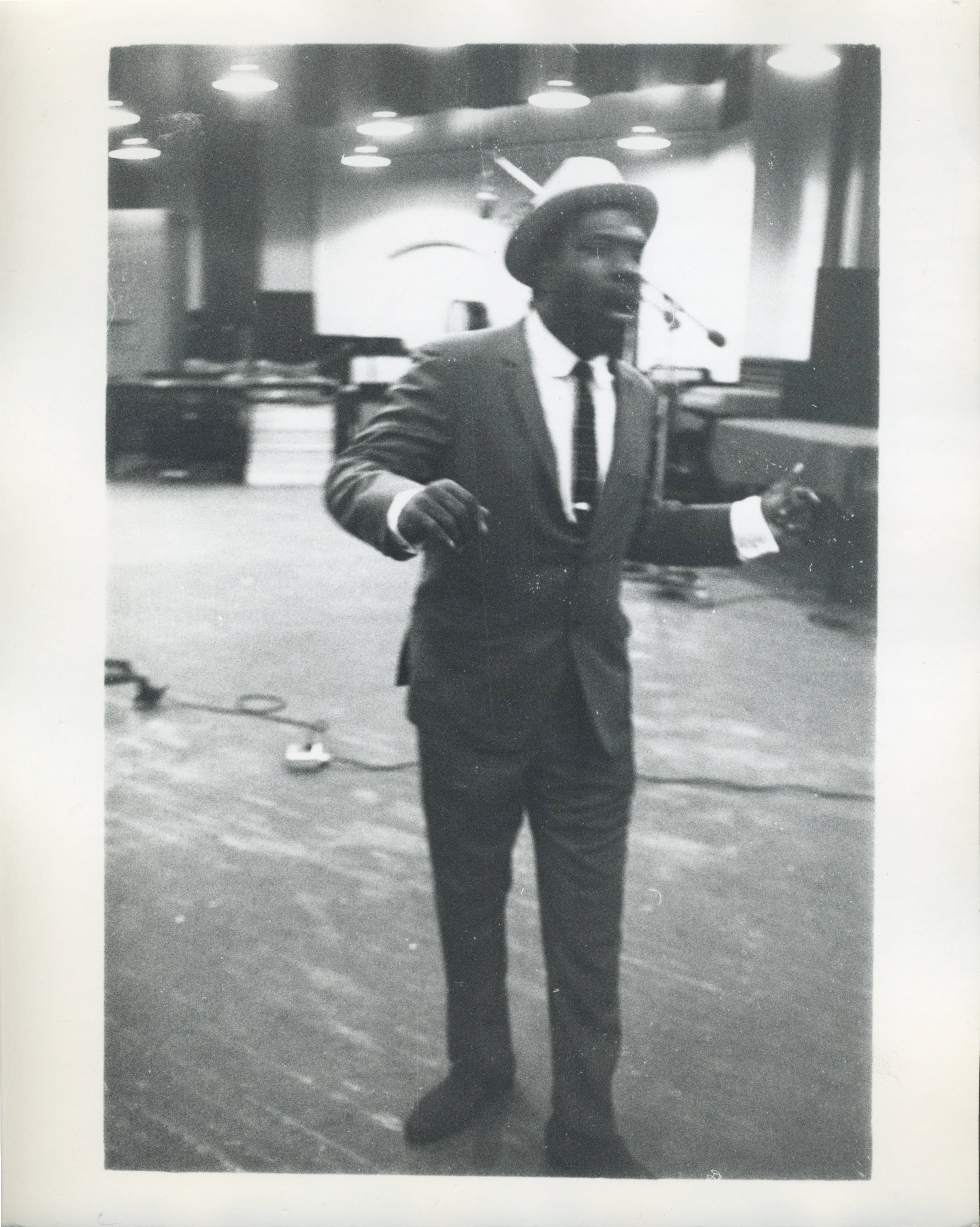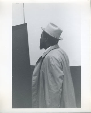 Two original doubleweight photographs of the influential American jazz pianist and composer, captured by photographer Doug Quackenbush ca. 1964. One photograph shows Monk in coat and hat from behind, while in the other he appears to be dancing or conducting in a mostly-empty studio. Stamped on the verso with photographer's credit. In fine condition, each 8 x 10 inches (20.4 x 25.2 cm).