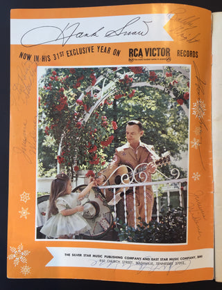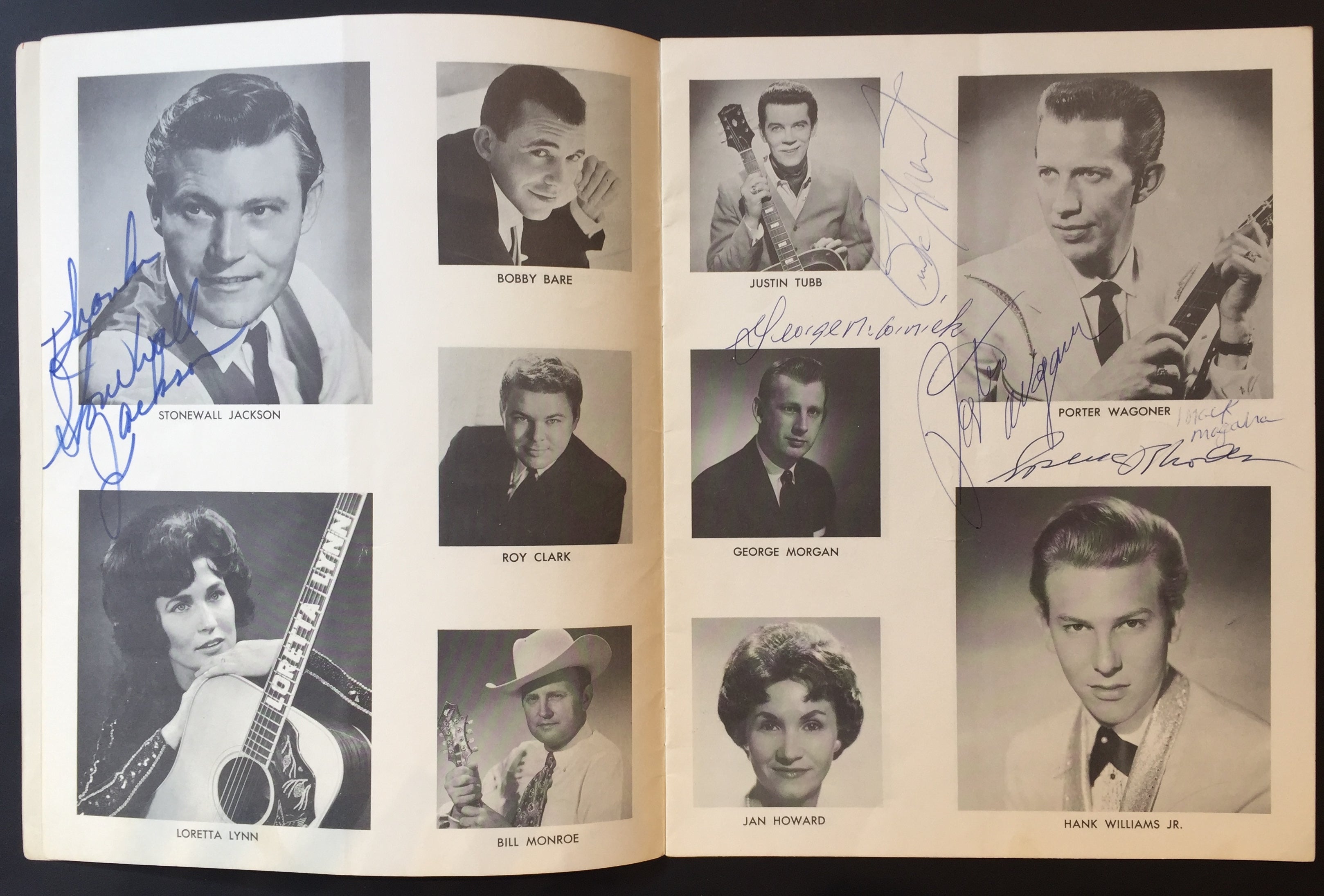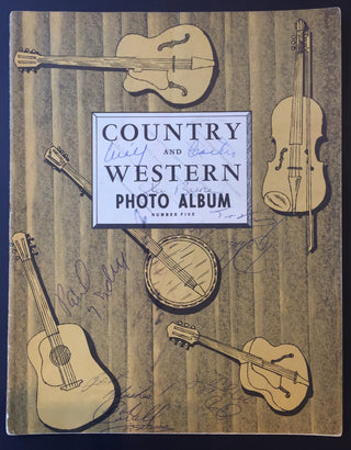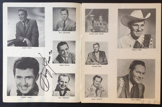 Two original signed 1960's country music publications, containing photographs of the most famous country and western acts of the day and signed throughout by more than 30 singers and performers. "Country and Western Photo Album number five" (n.d., ca. 1967) is signed on the cover by Wilf Carter, Debbie Lori Kaye and four others, and internally by Sonny James, Stonewall Jackson, Porter Wagoner and his band (George McCormick, Mack Magaha, Buck Trent, and Speck Rhodes), Carl Smith and Goldie Hill Smith, and Bill Phillips. 19 pp. of photographs and simple captions. "Country Music Scrapbook, 16th edition" (copyright 1967) contains signatures from Hank Snow and his band (Jimmie Widener, Bobby Wright, Kayton Roberts, and Chuck [?] Wise), Connie Smith and her band (Jack Watkins, Dick Overbey, and two others), a young Dolly Parton, Bobby Lewis, Carl and Pearl Butler, Darrell Garver, Ernest Tubb and three members of his band, Cal Smith, Juanita Rose, and Sonny James (and four members of his band including Duane West). 48 pp. In fine condition overall.