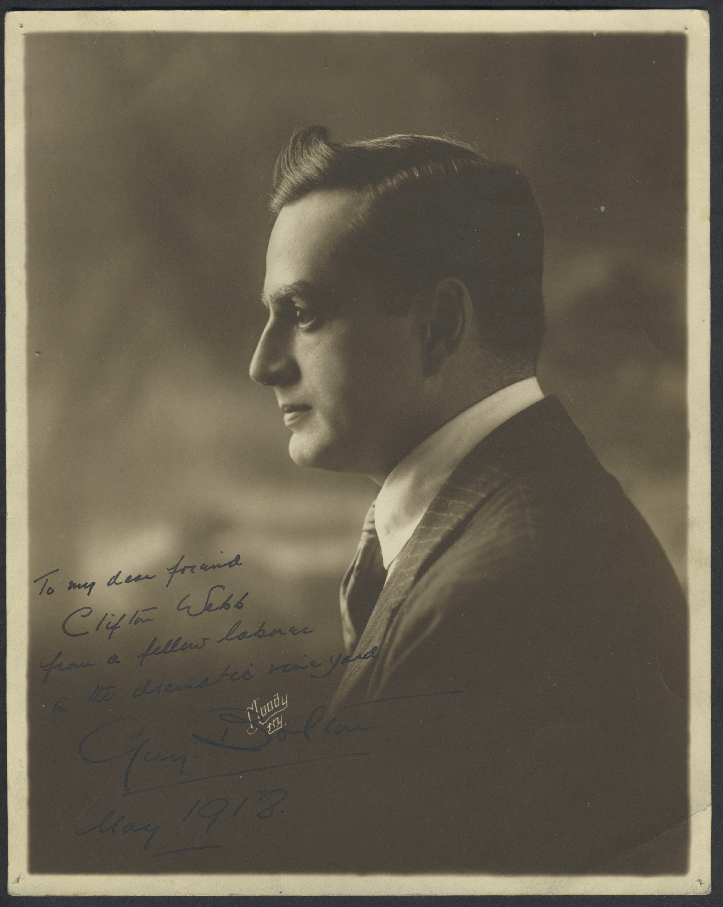 Bolton, Guy. (1884–1979) [Webb, Clifton. (1889–1966)]. Signed Photograph. Signed photograph from the Anglo-American playwright and writer of musical comedies, inscribed to actor Clifton Webb. Bolton is shown in a profile portrait by Moody of New York and has penned at the lower left: "To my dear friend / Clifton Webb / from a fellow laborer in the dramatic vineyard / Guy Bolton / May 1918." Light corner wear with tack holes and one small crease at the lower right; overall fine. 8 x 10 inches (20.2 x 25.3 cm).