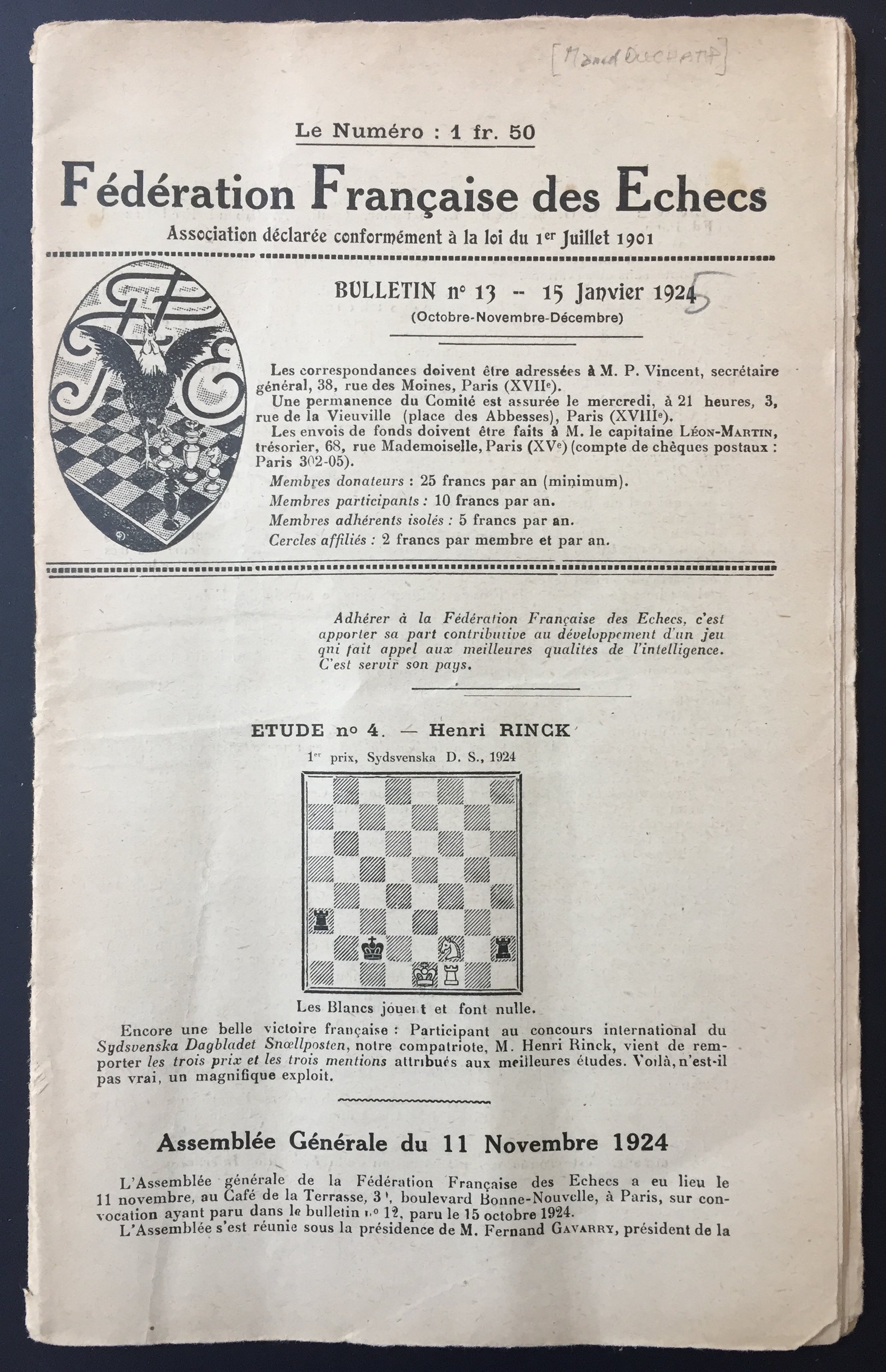 Fédération Française des Echecs: Bulletin no. 13 – 15 Janvier 192[5]. 32 pp. Dated January 15, 1924, corrected in pencil to 1925. Original bulletin of the French Chess Federation, reporting on meetings of the committee, recent games and tournaments, including the Upper Normandy tournament of 21–23 September 1924, of which the winner was Marcel Duchamp. The bulletin describes him on p. 21 (translated from the French): "The Upper Normandy champion, M. Duchamp, earned his title with his solid and profound playing. His imperturbable sang-froid, his ingenious style, the impeccable way in which he uses even the slightest advantage, make him a formidable opponent on all occasions." Toning and some edge wear; overall very good. 5.5 x 9 inches (14 x 22.7 cm).