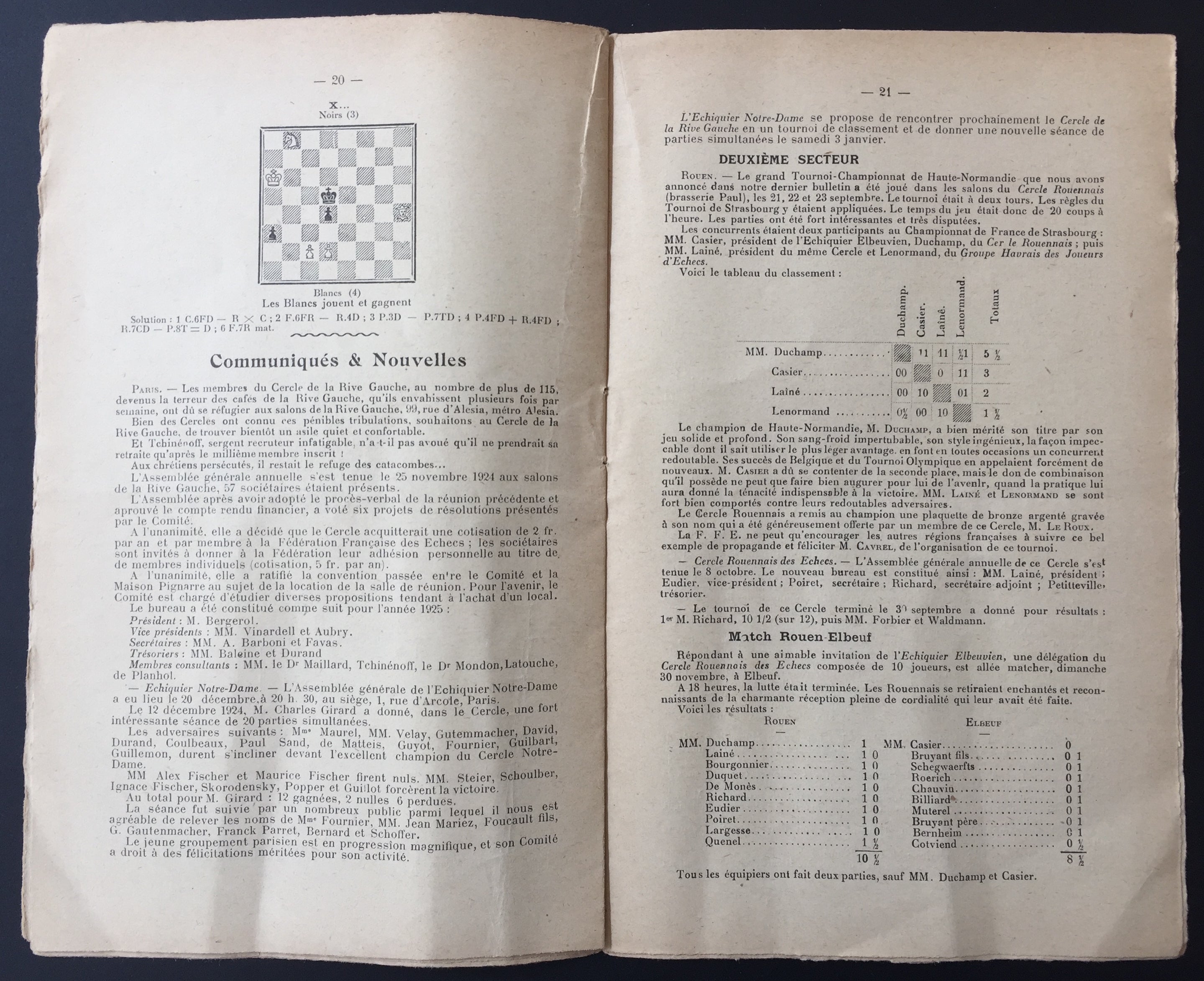 [Duchamp, Marcel. (1887–1968)]. Fédération Française des Echecs - French Chess Magazine Mentioning Duchamp's 1925 Championship Win.
