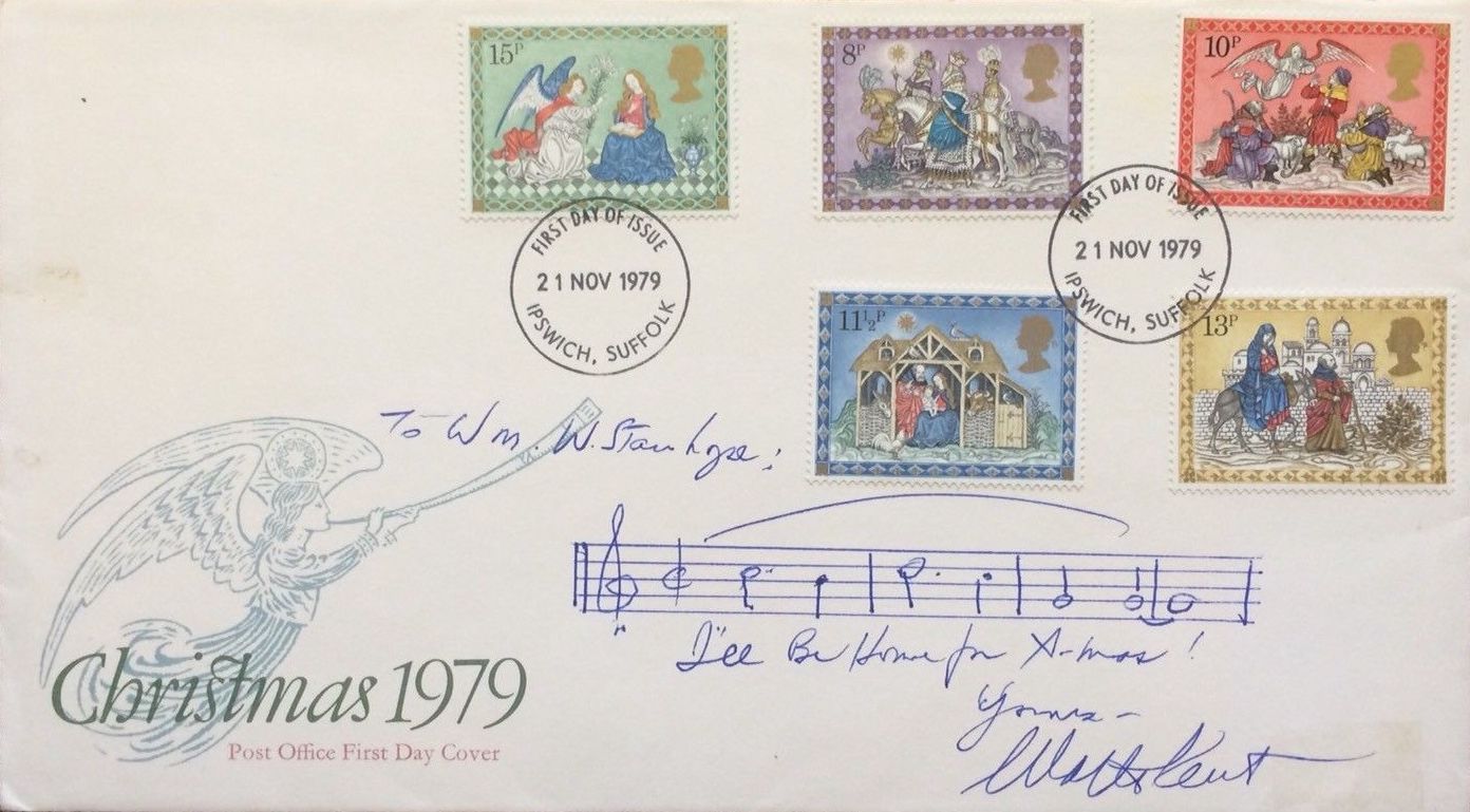 AMQS of the first four bars from his holiday classic "I'll be Home for Christmas," penned and signed "Yours - Walter Kent" by its composer, on a British first day cover for Christmas 1979. Postmarked November 21, 1979. Envelope with an insert describing the Christmas story depicted on the stamps. One slight smudge at the left and slight mounting remnant at the lower right; overall fine. 8.5 x 4.75 inches (21.6 x 12 cm).