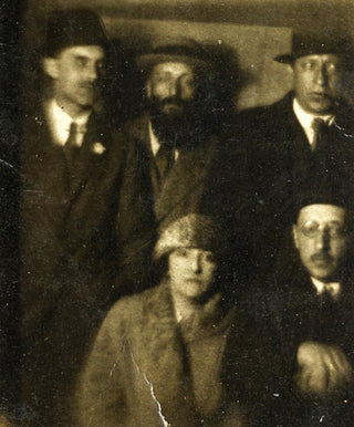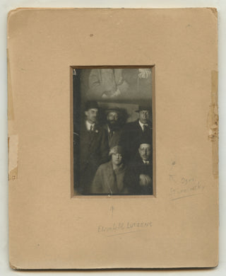 Original photograph, ca. 1920, of Stravinsky (front row right) together with Swiss conductor Ernest Ansermet (back row center), Russian director Vsevolod Meyerhold (back row right), and another man and woman. Although a note on the mat identifies the woman as English composer Elizabeth Lutyens, we believe this is erroneous. Visible size 1.75 x 2.5 inches (4.3 x 6.7 cm), matted to 4.25 x 5.25 inches and tipped to a larger sheet (could be removed.) Mat toned with tape remnants, but otherwise fine.