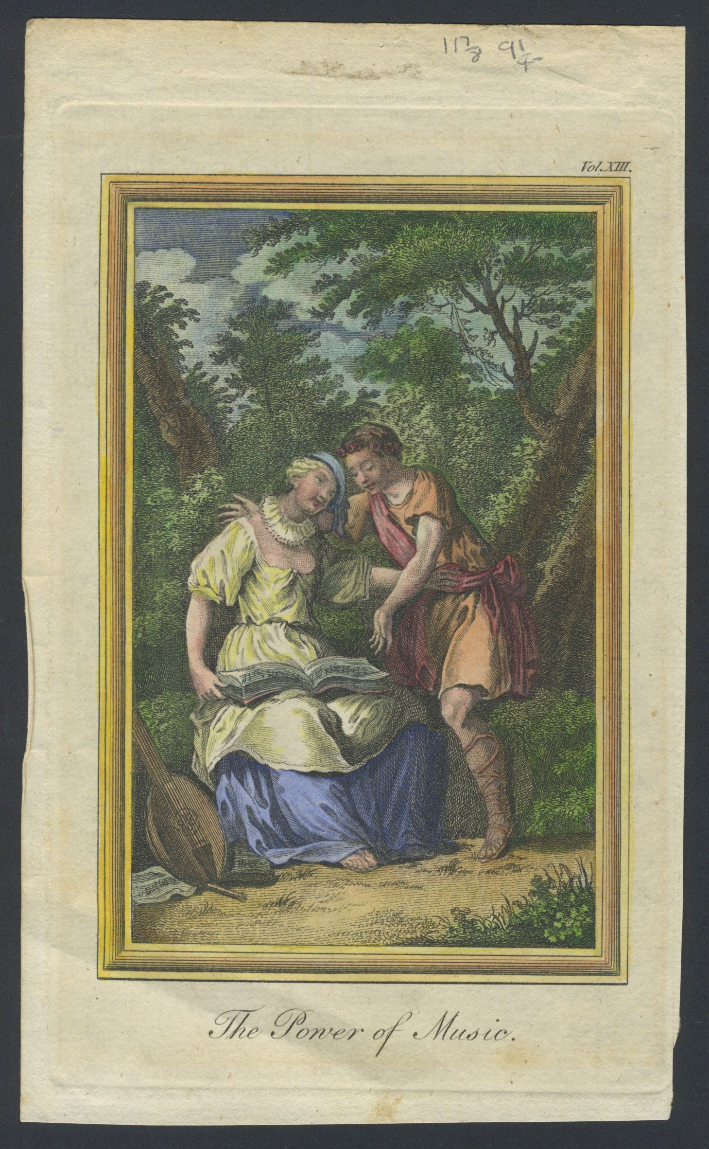Original hand-colored engraving, depicting a man and woman meeting in the woods over a book of songs, with a lute and recorder lying nearby. At the foot: "The Power of Music"; at the head, "Vol. XIII." Slightly irregularly trimmed with a pencil notation in the upper margin, some light toning. Overall fine. 4.5 x 7.5 inches (11.6 x 19.2 cm).