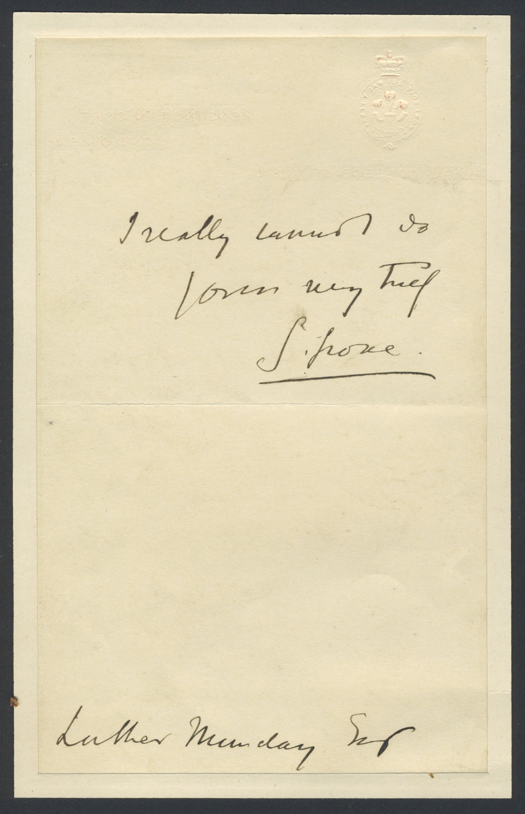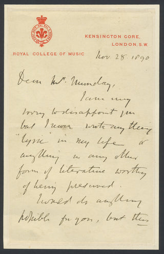 Autograph letter from the founding editor of Grove's Dictionary of Music and Musicians and the first director of the Royal College of Music, to the lecturer and theatrical producer Luther Munday. November 28, 1890. 2 pp. Grove writes: "Dear Mr Munday, I am very sorry to disappoint you but I never wrote any thing 'lyric' in my life or anything in any other form worthy of being preserved. Would do anything possible for you, but this I really cannot do..." In fine condition; edges neatly reinforced with paper. 4.5 x 7.5 inches (11.8 x 18.6 cm).