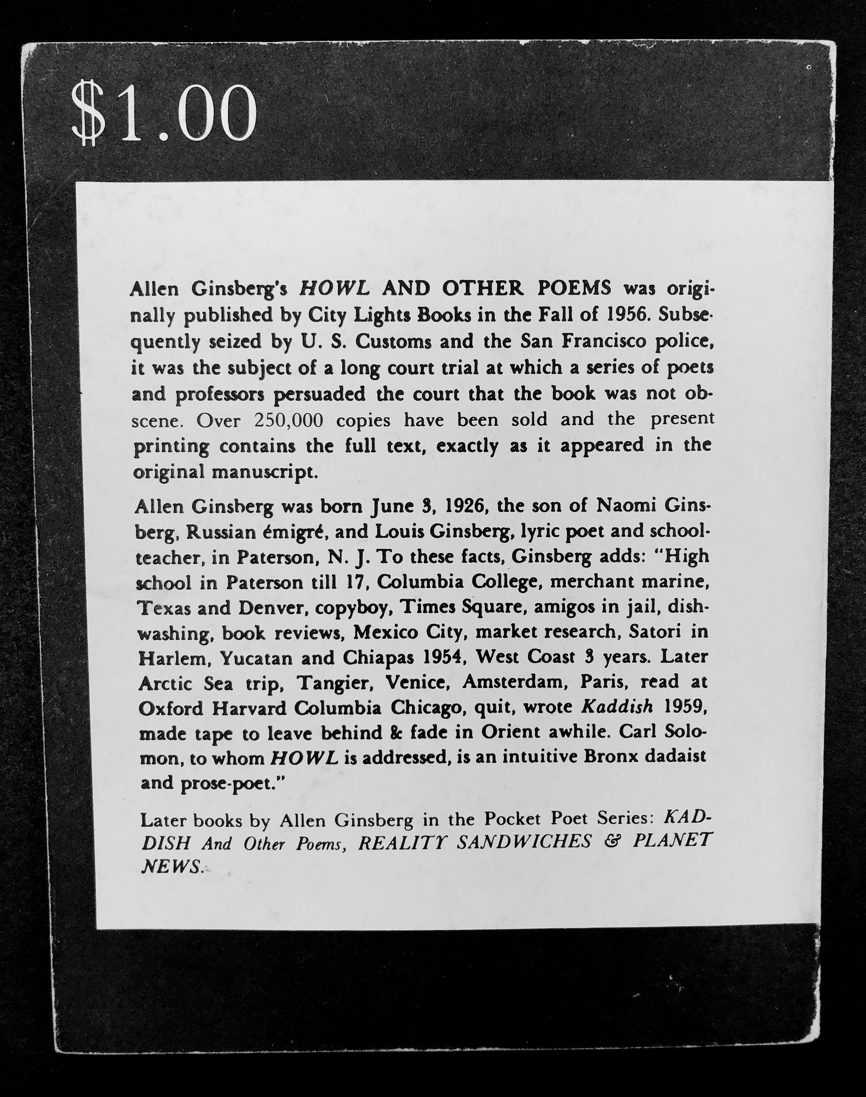 Ginsberg began work on "Howl" in 1954. In the Paul Blackburn Tape Archive at the University of California, San Diego, he can be heard reading early drafts of his poem to his fellow writing associates. Howl and Other Poems was first published in the fall of 1956 as number four in the Pocket Poets Series from City Lights Books. The poem is now considered one of the great works of American literature.