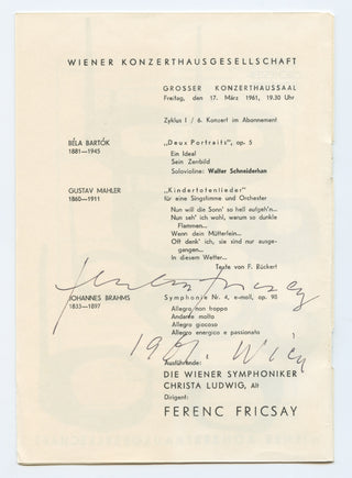 Fricsay, Ferenc. (1914–1963). Signed Program. Signed program from the Hungarian conductor, who directed the Vienna Symphonic Orchestra with alto Christa Ludwig on March 17, 1961. Fricsay has signed over the program listing, dating Vienna, 1961. The program included Mahler's Kindertotenlieder and Brahms' Symphony no. 4. 6 pp. Some light wear but overall in fine condition, together with a promotional flyer for Fricsay's recordings. 5.75 x 8.25 inches (14.7 x 21 cm).