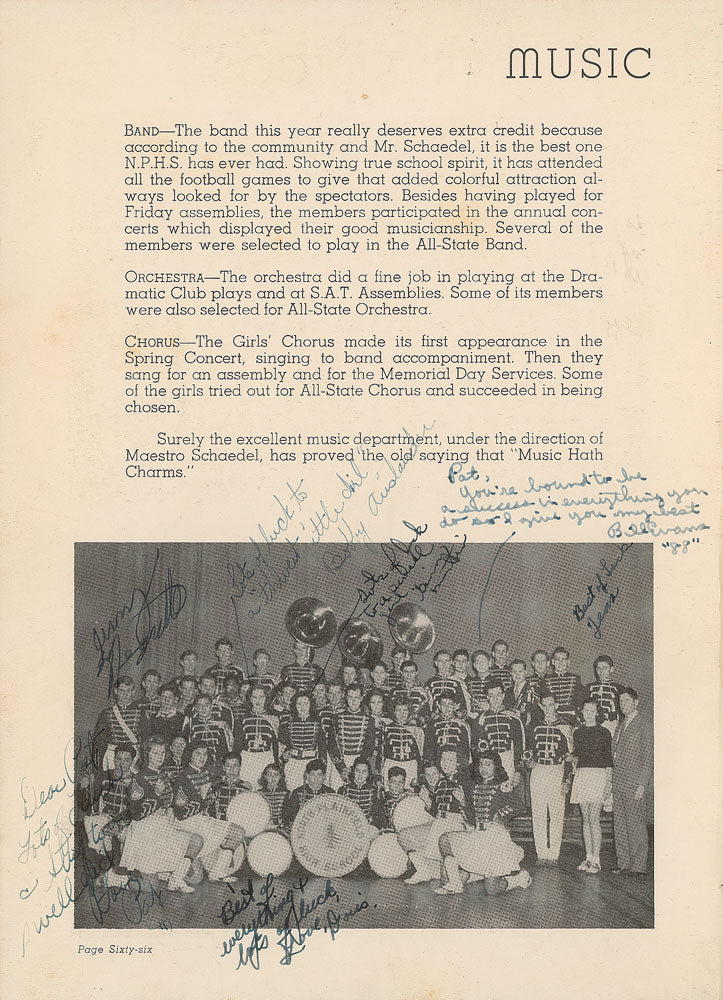Uncommon 1945 Canuck yearbook from Bill Evans’ junior year at North Plainfield High School in North Plainfield, New Jersey. 8 x 11 inches, signed and inscribed on page 66 in black ink, “Pat, You’re bound to be a success in everything you do so I give you my best, Bill Evans ’88,’” with Evans pictured as a member of the band. In overall very good condition, with expected wear and aging to the covers; interior pages are clean. Scarce in any form, this is undoubtedly one of the earliest signed photographs of the great musician!