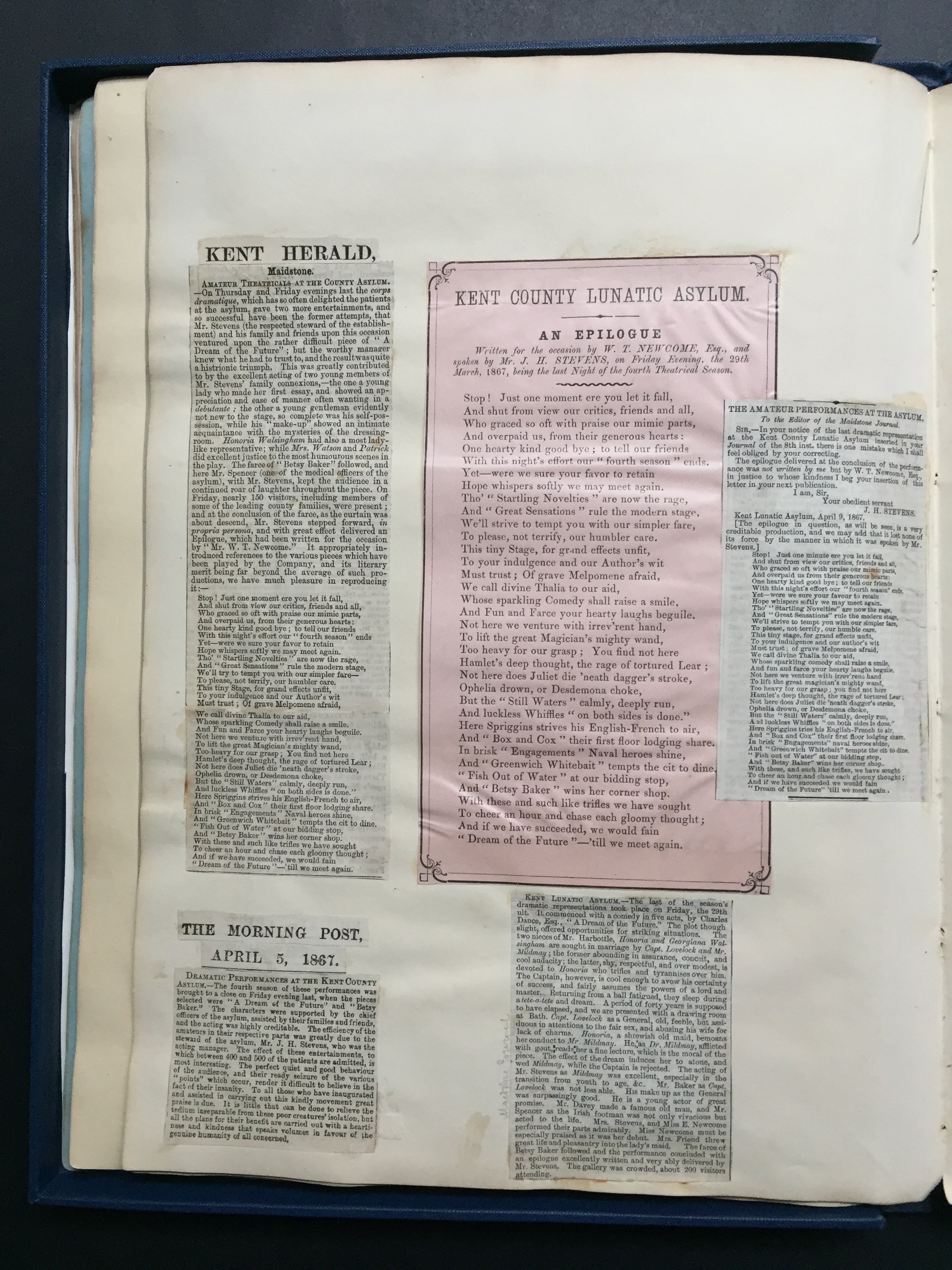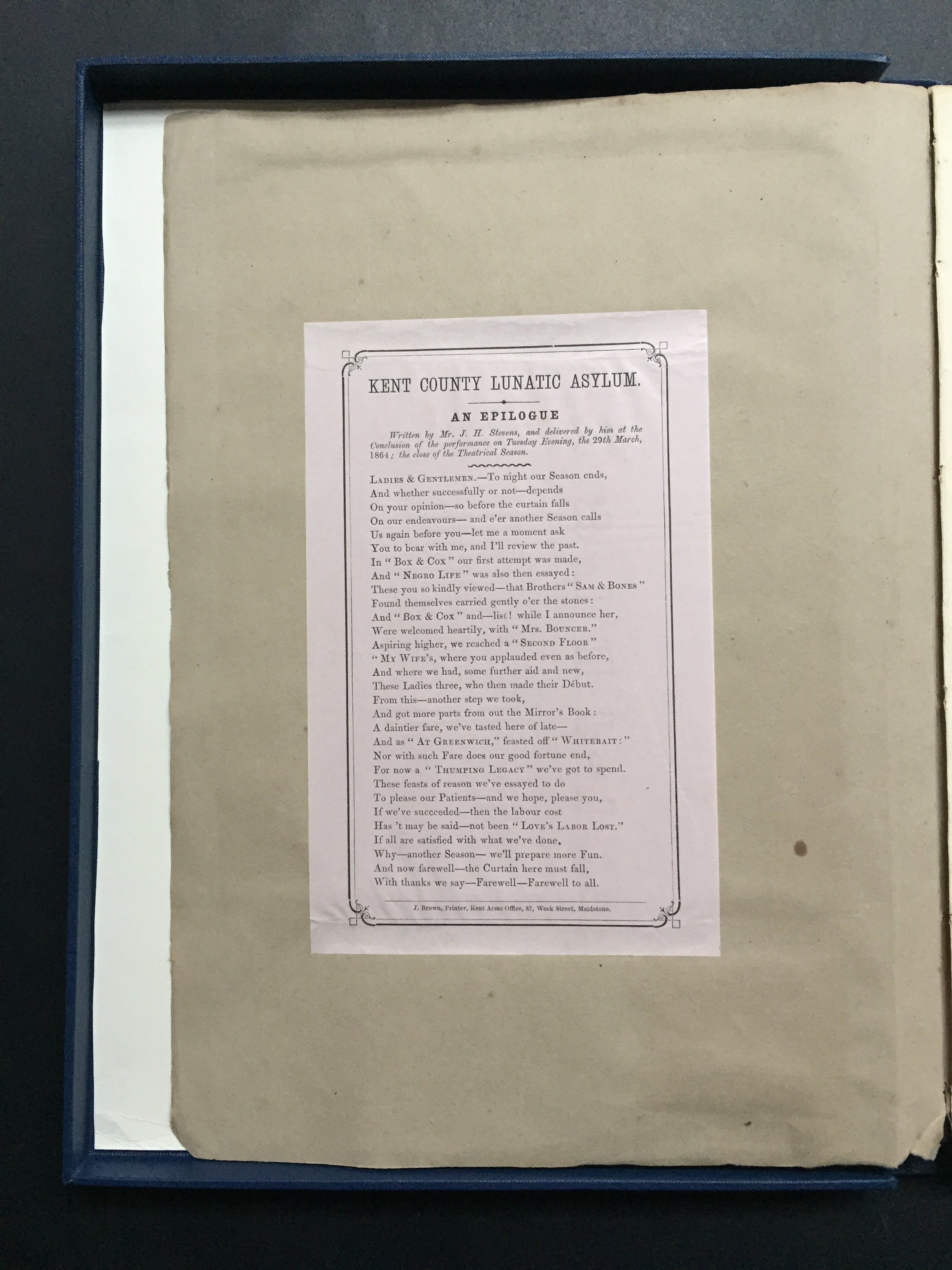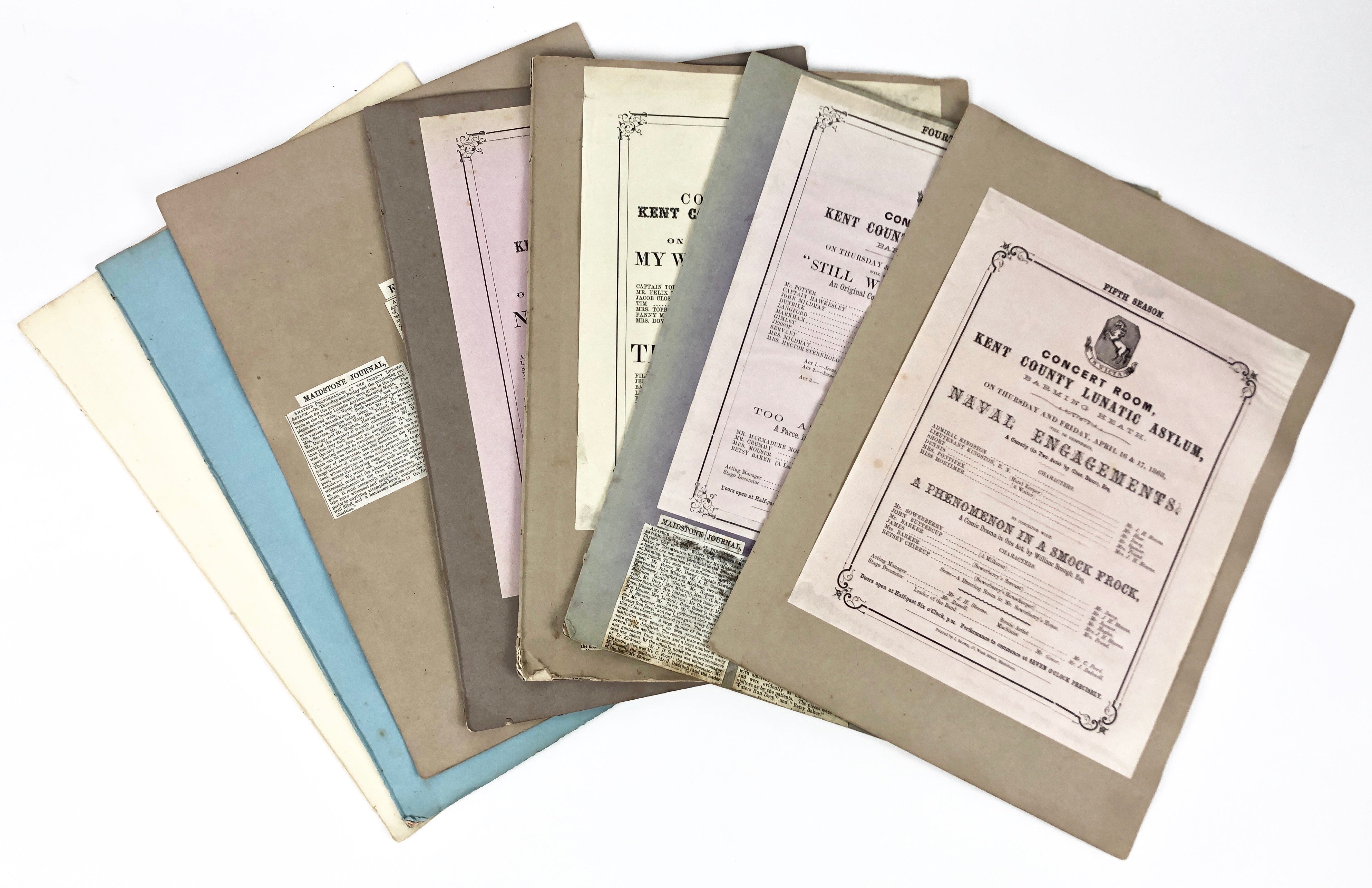[Lunatic Asylum] Stevens, J. H. & Newcome, W. T.. Archive of Materials Relating to Amateur Dramatics at the Kent County Lunatic Asylum, 1860's. A highly interesting collection of ephemera relating to amateur dramatics taking place at the Kent County Lunatic Asylum in Kent, England in the 1860's. The archive contains 15 programs, a prologue and two epilogues, a photograph of an actor, and 28 newspaper clippings, nicely laid down on scrapbook pages which are housed in a custom cloth box. Taken together, the items give a fascinating and unusual view into the Victorian treatment of the mentally ill.