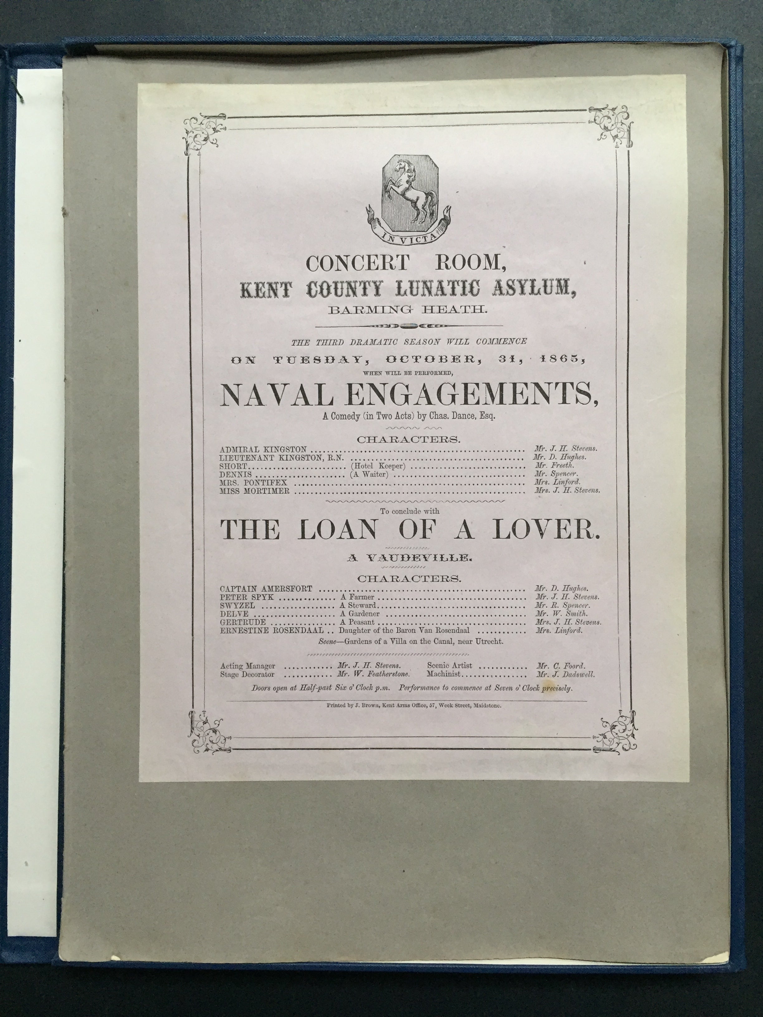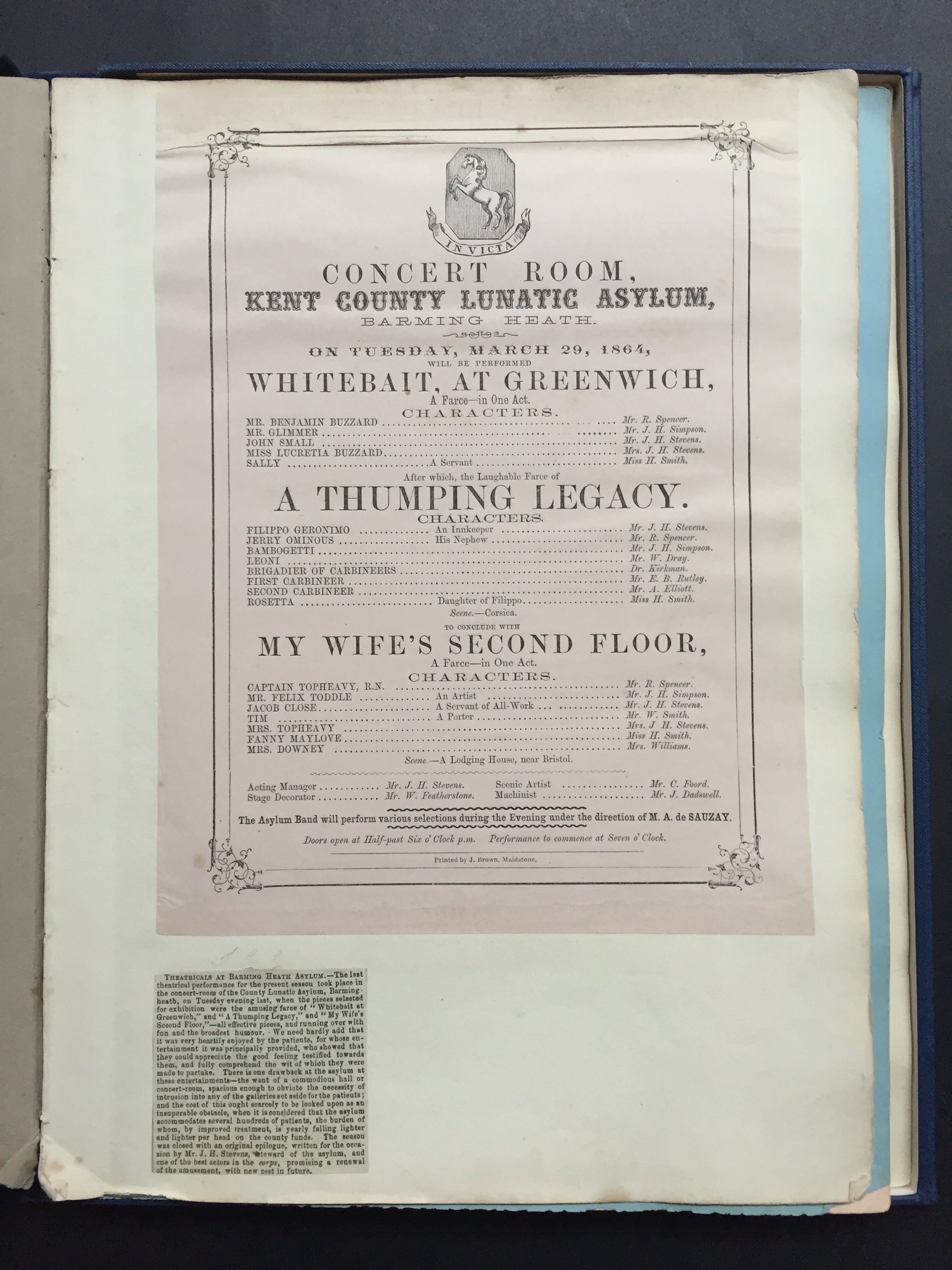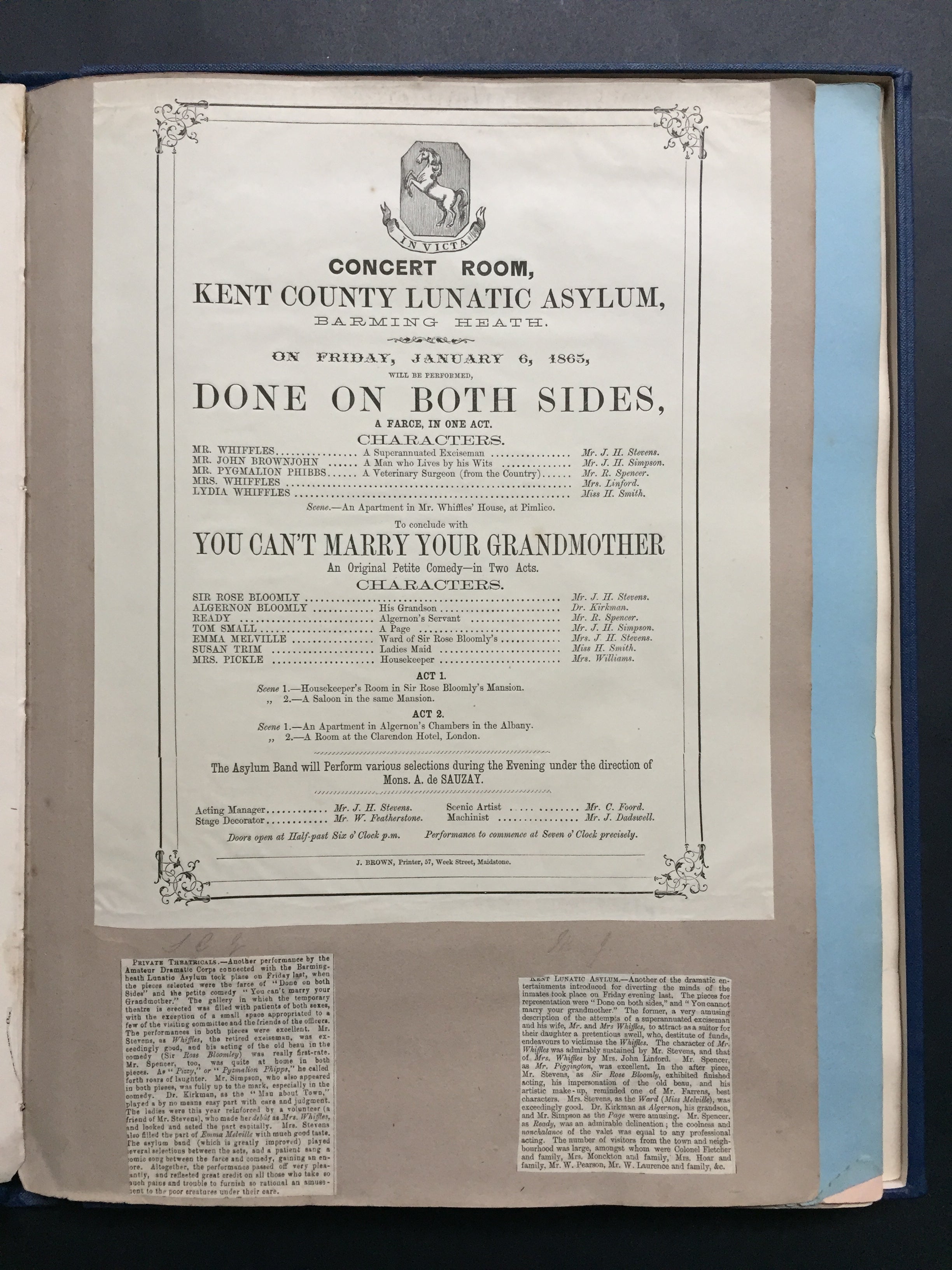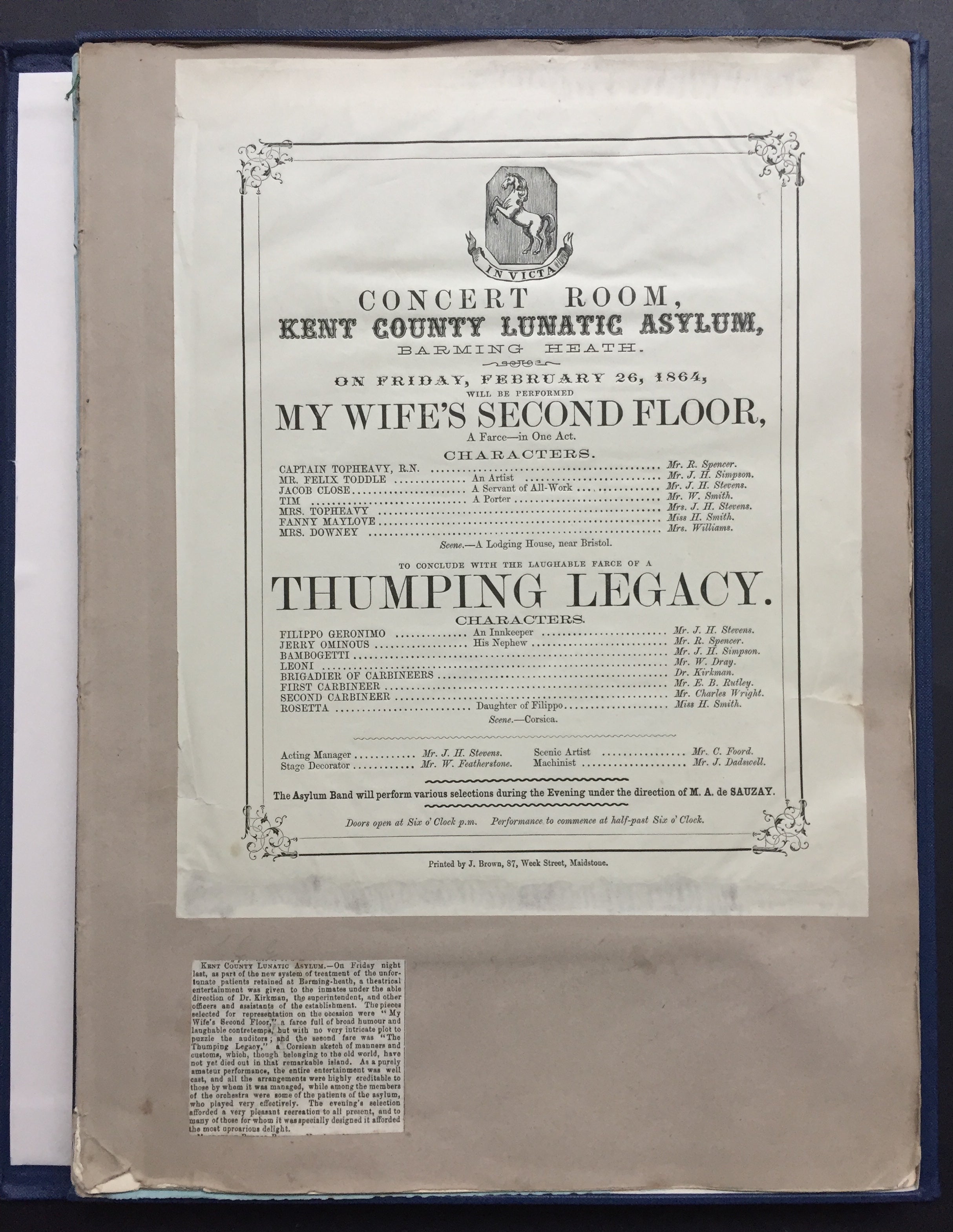 [Lunatic Asylum] Stevens, J. H. & Newcome, W. T.. Archive of Materials Relating to Amateur Dramatics at the Kent County Lunatic Asylum, 1860's. A highly interesting collection of ephemera relating to amateur dramatics taking place at the Kent County Lunatic Asylum in Kent, England in the 1860's. The archive contains 15 programs, a prologue and two epilogues, a photograph of an actor, and 28 newspaper clippings, nicely laid down on scrapbook pages which are housed in a custom cloth box. Taken together, the items give a fascinating and unusual view into the Victorian treatment of the mentally ill.