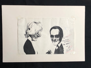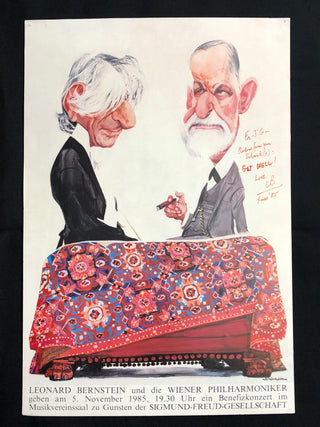 Bernstein, Leonard. (1918–1990). Signed Poster. Signed poster from the beloved American composer and conductor, advertising a concert of the Vienna Philharmonic under Bernstein on November 5 1985 to benefit the Sigmund-Freund-Gesellschaft. Bernstein and Freud are shown caricatured facing one another above a rug-draped sofa. Bernstein has inscribed the poster to his assistant, the composer Jack Gottlieb, at the right in red marker: "For J. G. - Order from your Schrink(s): GET WELL! Love, LB / Xmas '85." Taped to the verso is a doctored photocopy of the upper half of the poster, with Freud's face replaced with another face (apparently Jack Gottlieb) and the inscription altered in red pencil to: "For LB—Order from your Schrink: GET WELL! Love, JG / Columbus Day '90." Bernstein died on October 14, 1990, just a week later. Poster mounted on same-size foam board. Some light soiling; pinholes in corners; overall fine. 17 x 25 inches (43 x 63 cm).