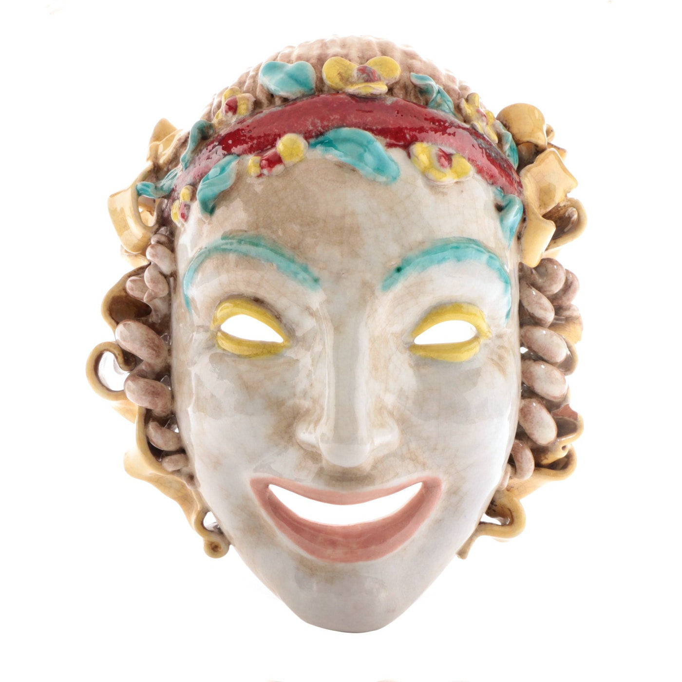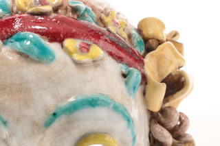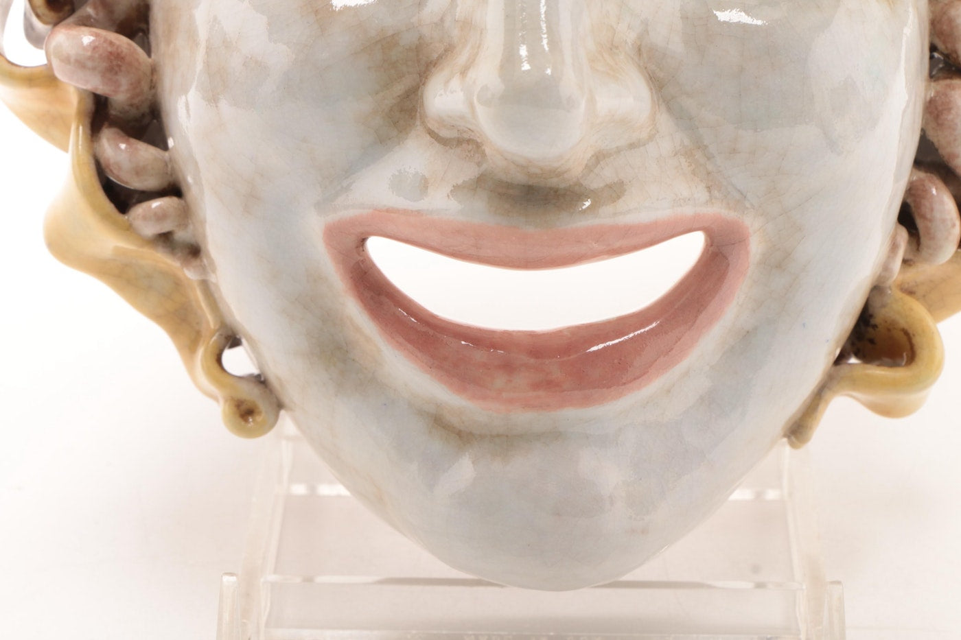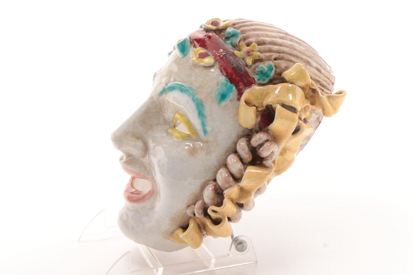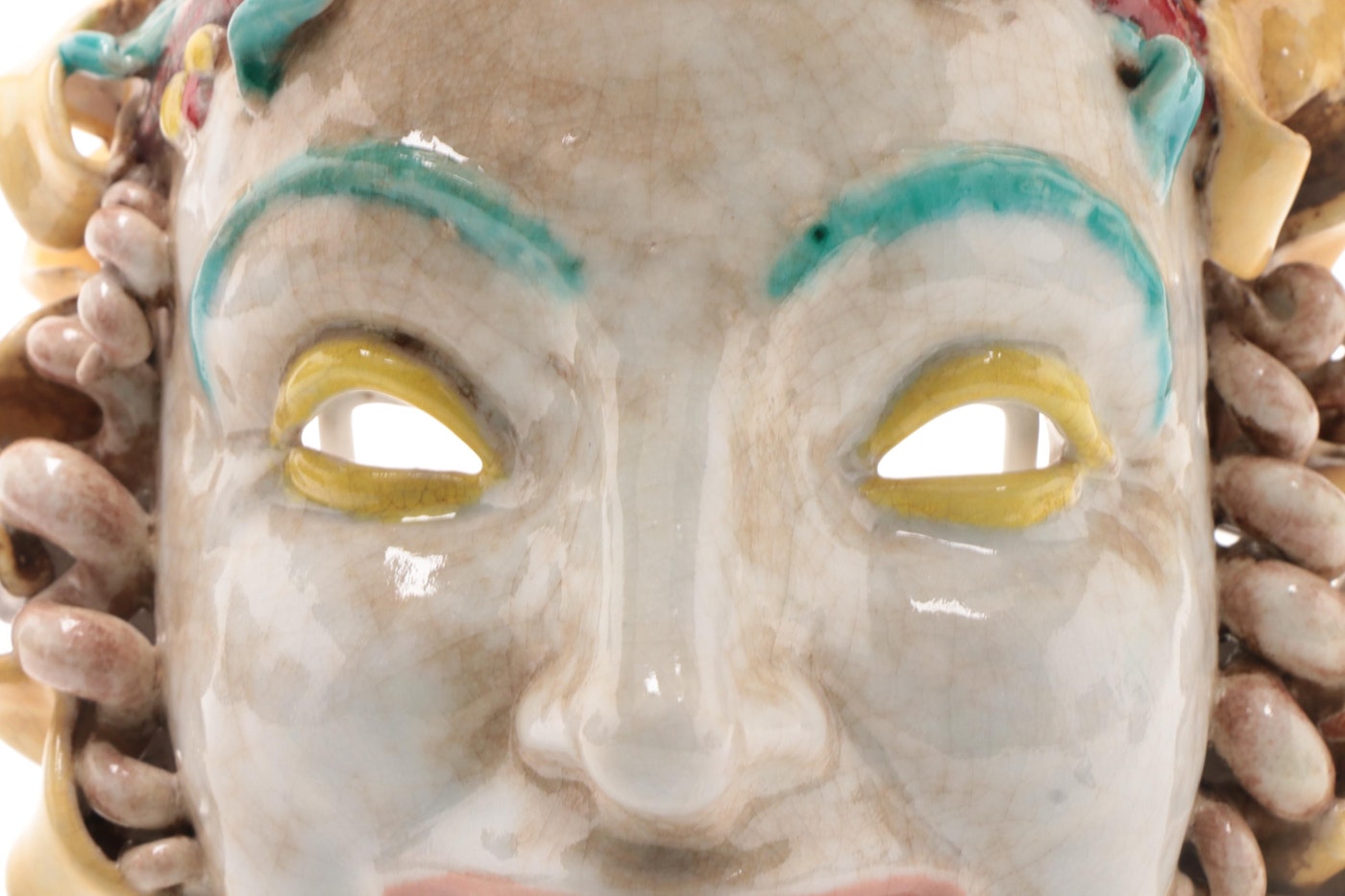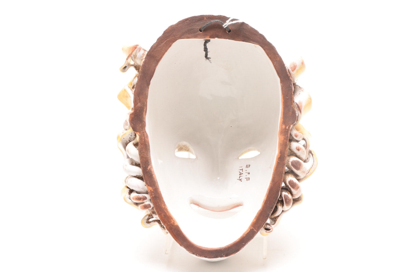 Pattarino, Eugenio. (1885–1971). Ceramic Mask. Signed, hand painted ceramic mask by the Italian artist known for his majolica sculptures of Roman Catholic influence, with his sculptures presented by the Vatican as gifts to foreign diplomats, including President John F. Kennedy. The mask features a glossy finish to the face and hair and bears accents in yellow around the eyes and eyebrows finished in blue. Signed to the reverse, ready to hang by wire. Light crazing and discoloration to white glaze; one chip to the yellow hair. Overall very fine. 8 x 9 x 4 inches.