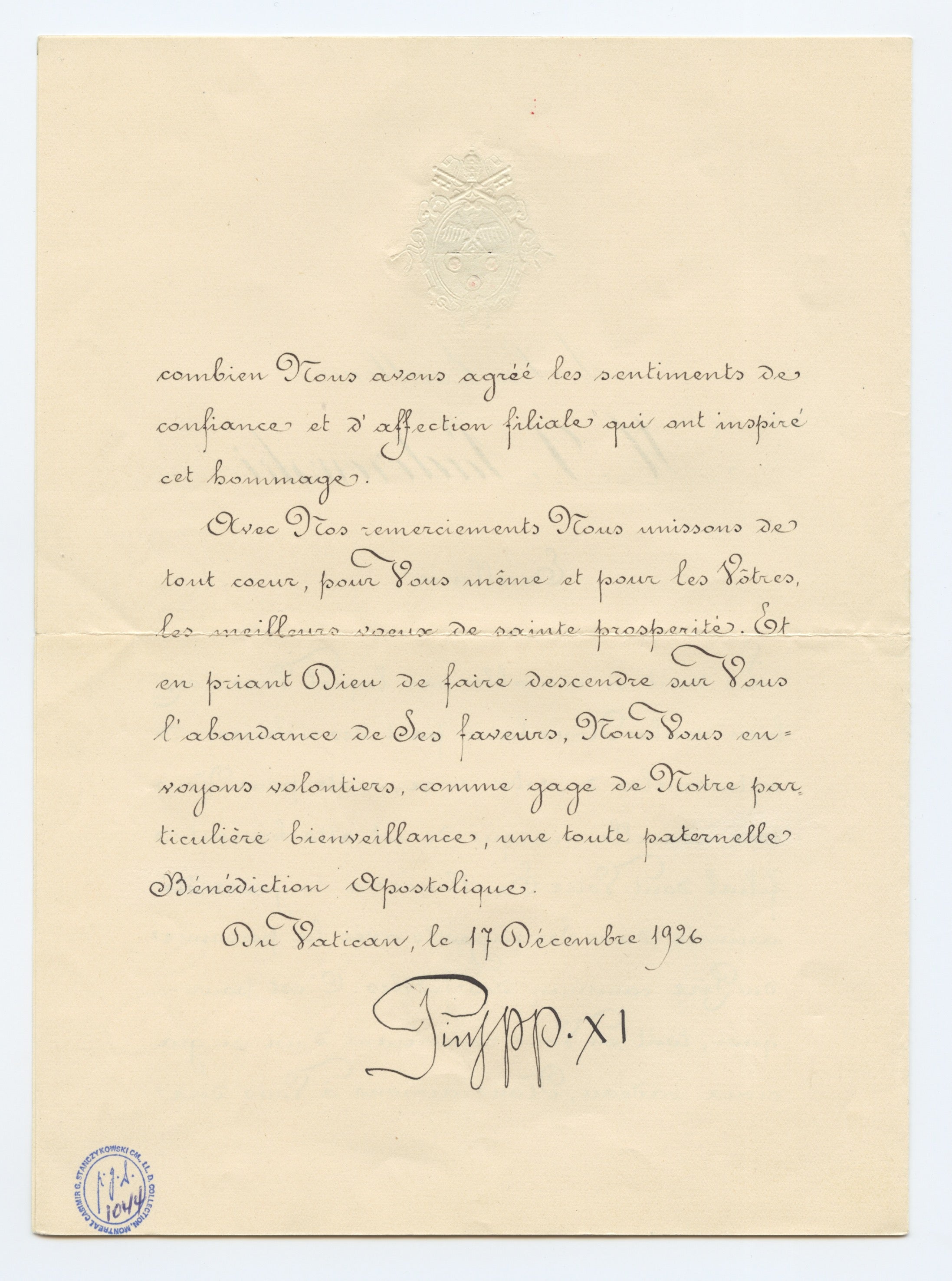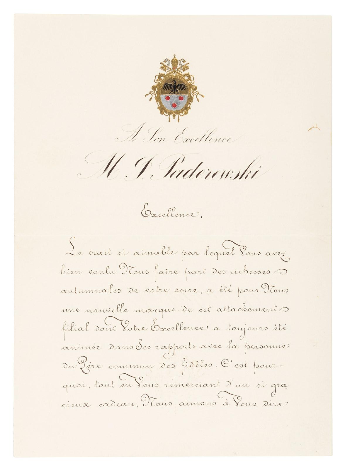 Handwritten letter to the Polish pianist and politician, signed by Pope Pius XI, expressing thanks for a gift from Paderewski's greenhouse and concluding with a Papal benediction. December 17, 1926. 2 pp. Attractively calligraphed in French on both sides of the first sheet of a folded leaf. Adorned with the Pope's gilt embossed seal at the head of the first page. With original envelope with wax seal. Collector's stamp to the second page and to the envelope. Some light handling wear and folding creases; overall fine. 9 x 6.75 inches (17.2 x 23.4 cm).