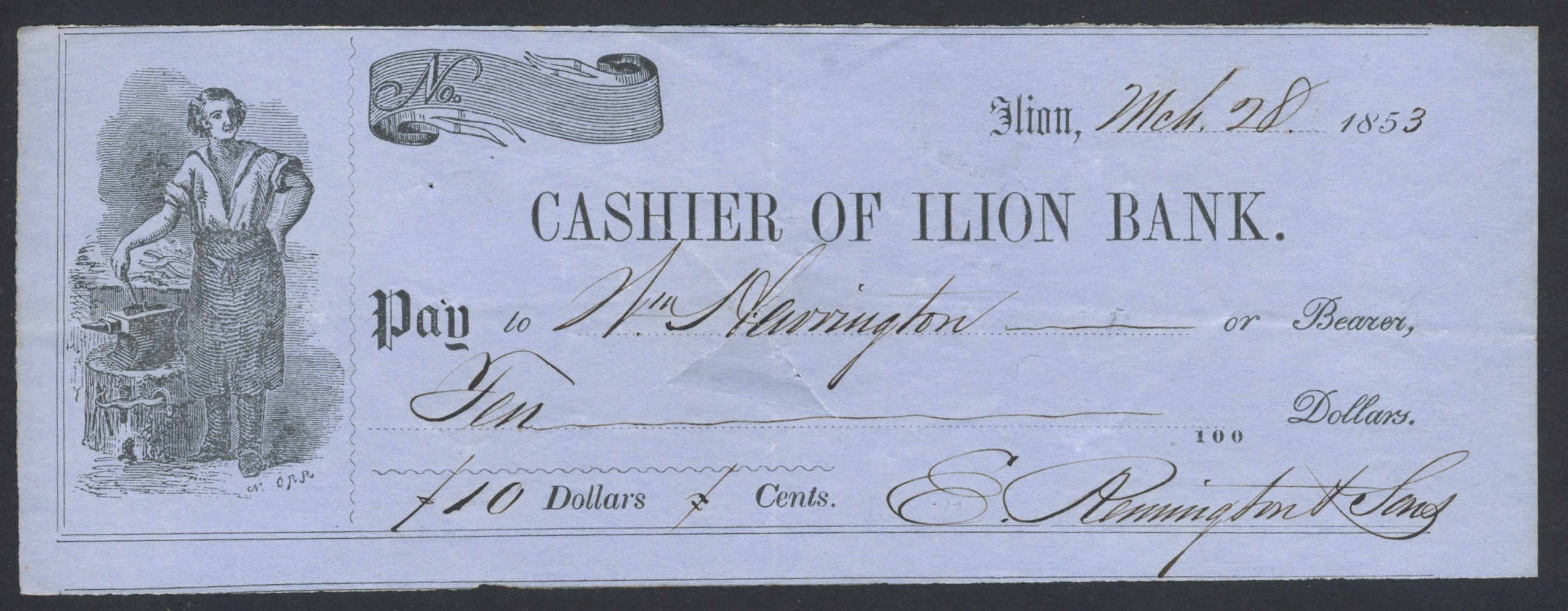 [Guns] Remington, Eliphalet. (1793–1861). Signed 1853 Bank Check. Signed bank check from the founder of the Remington Arms Co., dated March 28, 1853. Partially printed with a woodcut of a blacksmith at left, drawn on the Cashier of Ilion Ban, made payable to "Wm. Harrington" for ten dollars, and signed "E. Remington & Sons" at the lower right. Small cross-shaped tear to the center, otherwise fine. 7.25 x 2.5 inches (18.4 x 6.7 cm).
