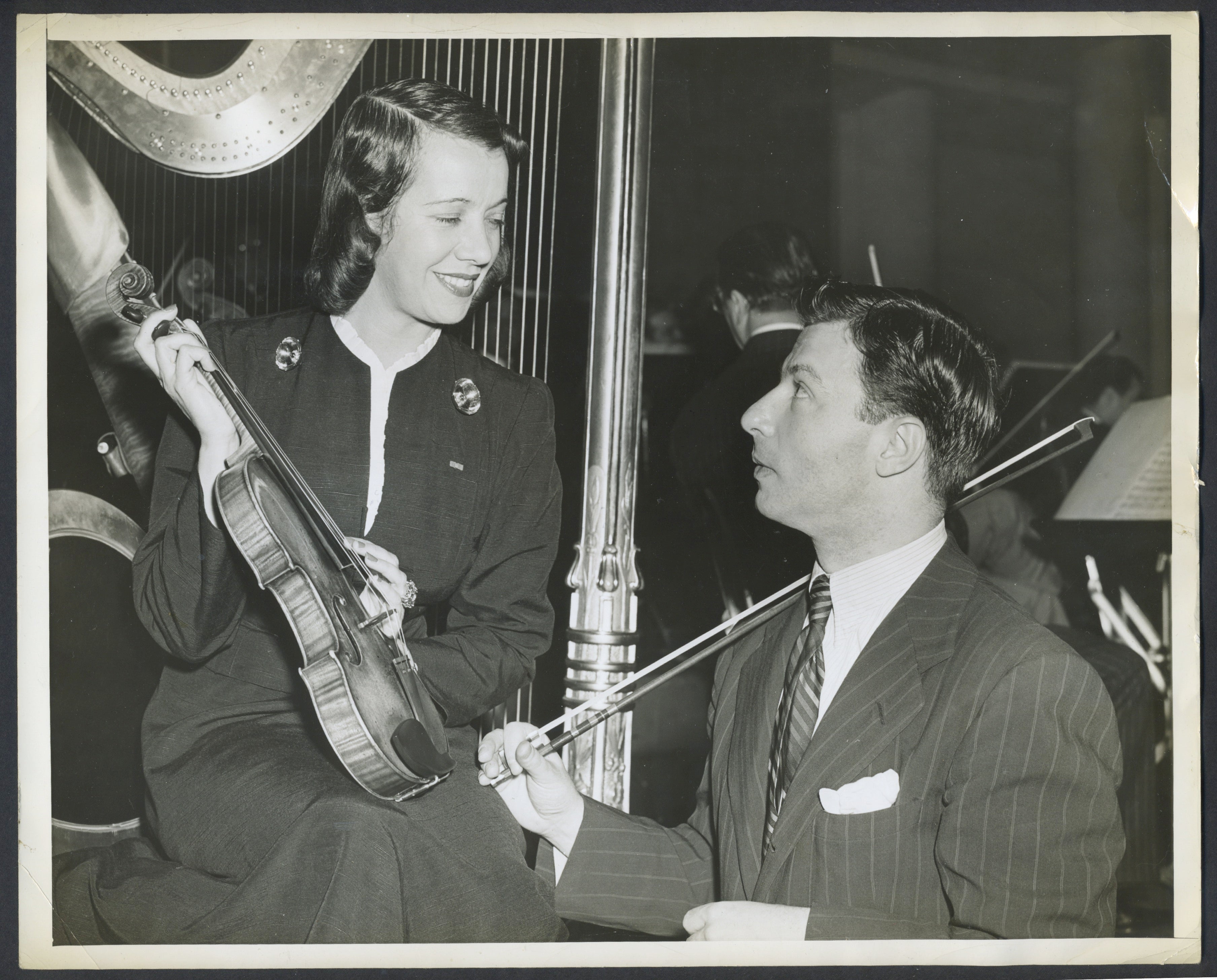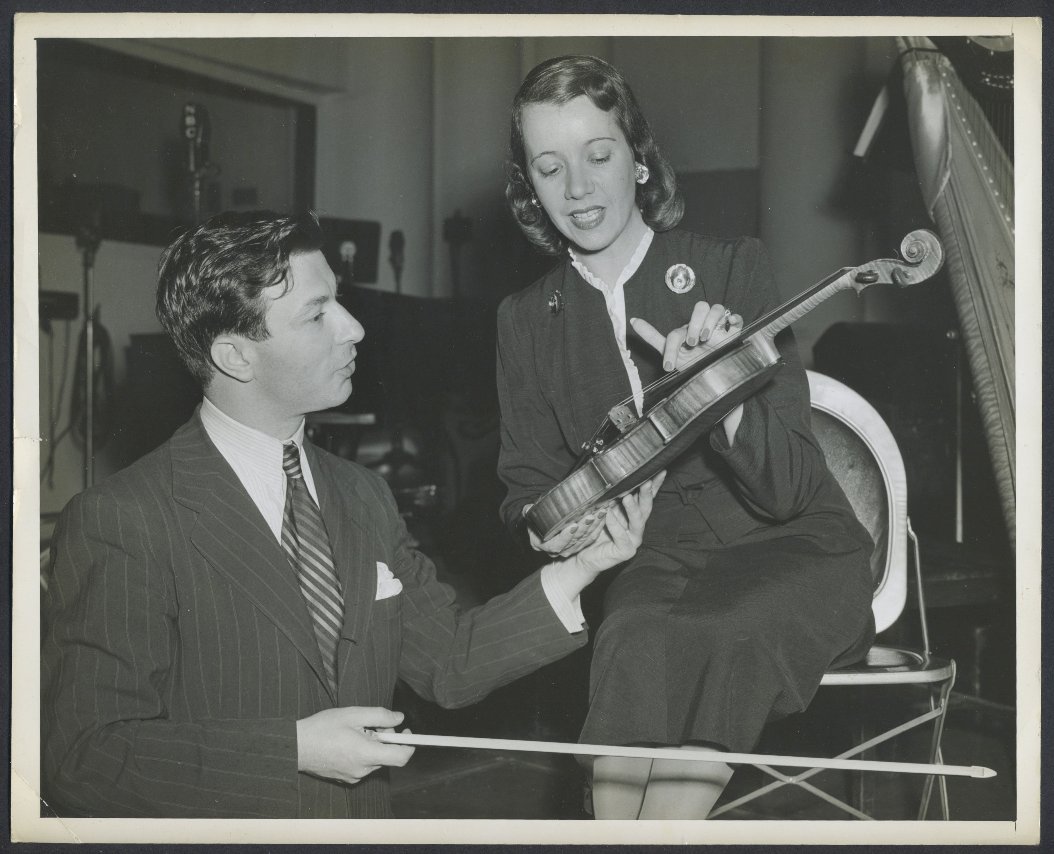 Milstein, Nathan. (1903–1992) & Pons, Lily. (1898–1976). Two Photographs Showing His Violin. Two vintage photographs of the great violinist with soprano Lily Pons, ca. 1950's. Milstein is seen showing off his violin, presumably the 1716 ‘Goldman’ Stradivari, which he later renamed the ‘Marie-Thérèse’ after his wife and daughter. Stamped on the verso by the United Seamen's Service. Some very light corner creases, but overall very fine. 10 x 8 inches (25.5 x 20.8 cm).