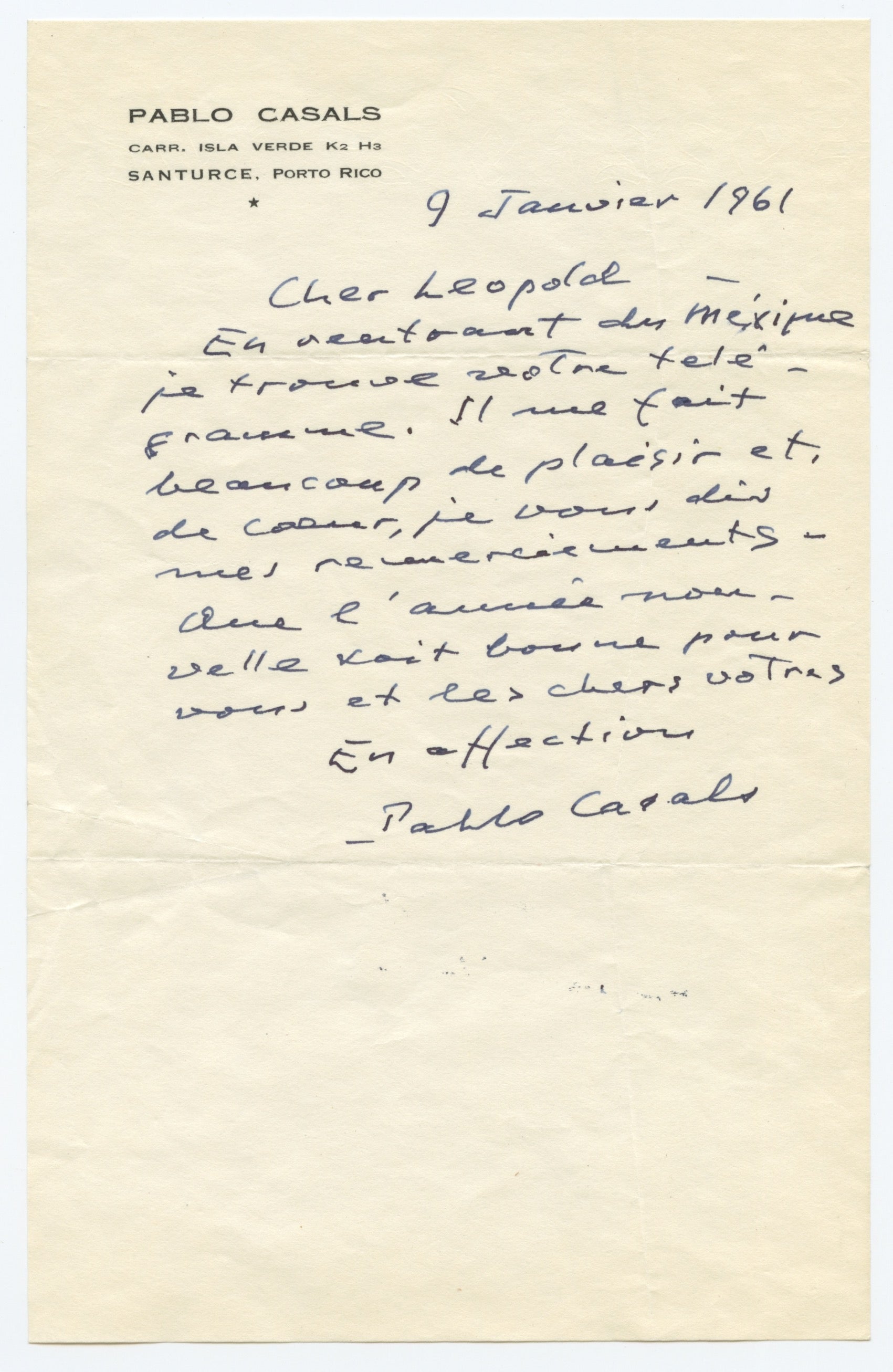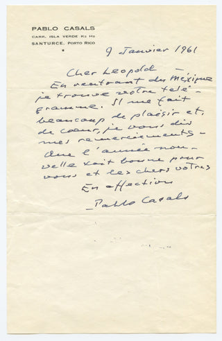 Autograph letter from the important cellist and composer. January 9, 1961; 1 p. Translated from the French: "Dear Leopold, on my return from Mexico I found your telegram. It gave me great pleasure and, from the heart, I thank you—and may the new year be good for you and those dear to you. Affectionately, Pablo Casals." Folding creases; overall fine. 5.5 x 8.5 inches (13.6 x 21.3 cm).