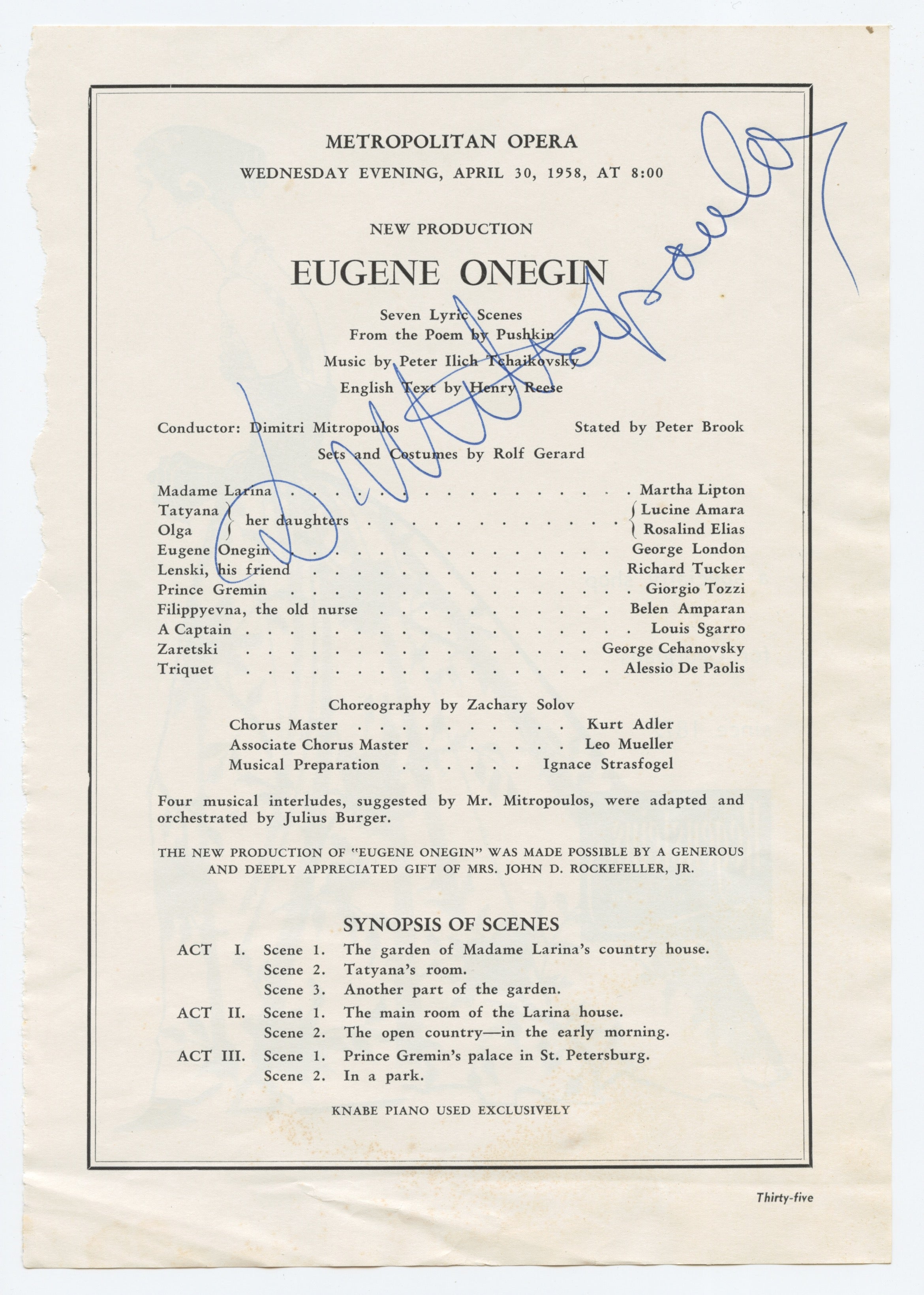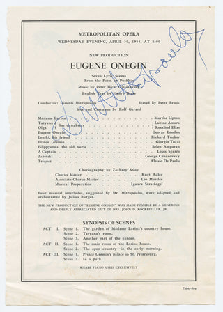 Mitropoulos, Dimitri. (1896–1960). Signed Program Page. Signed program page from the American conductor, pianist and composer of Greek birth. He has signed boldly across the cast listing from an April 30, 1958 performance of Eugene Onegin at the Metropolitan Opera. Left edge rough; some foxing; overall very good. 7.25 x 10.5 inches (18.6 x 26.6 cm).