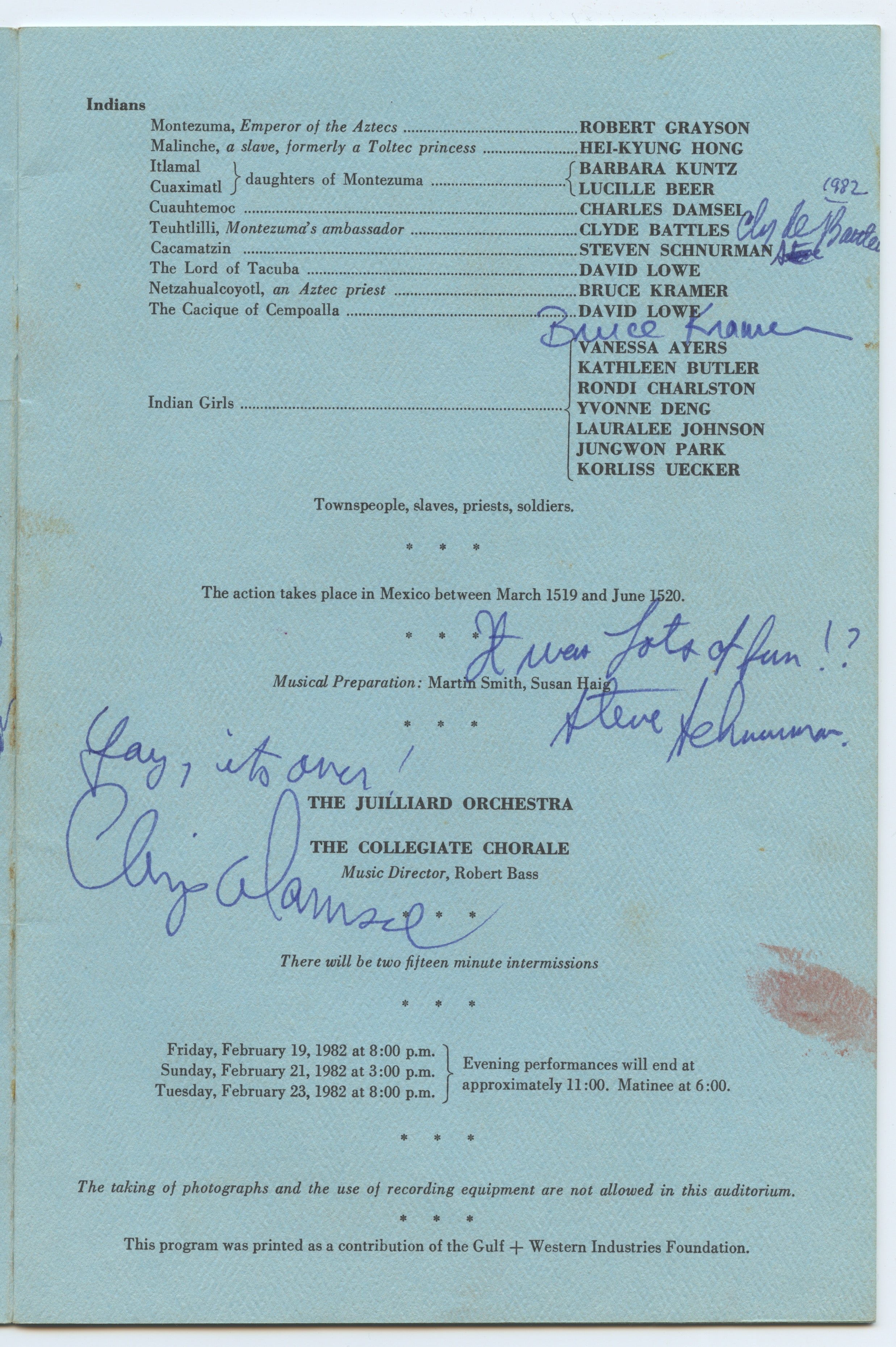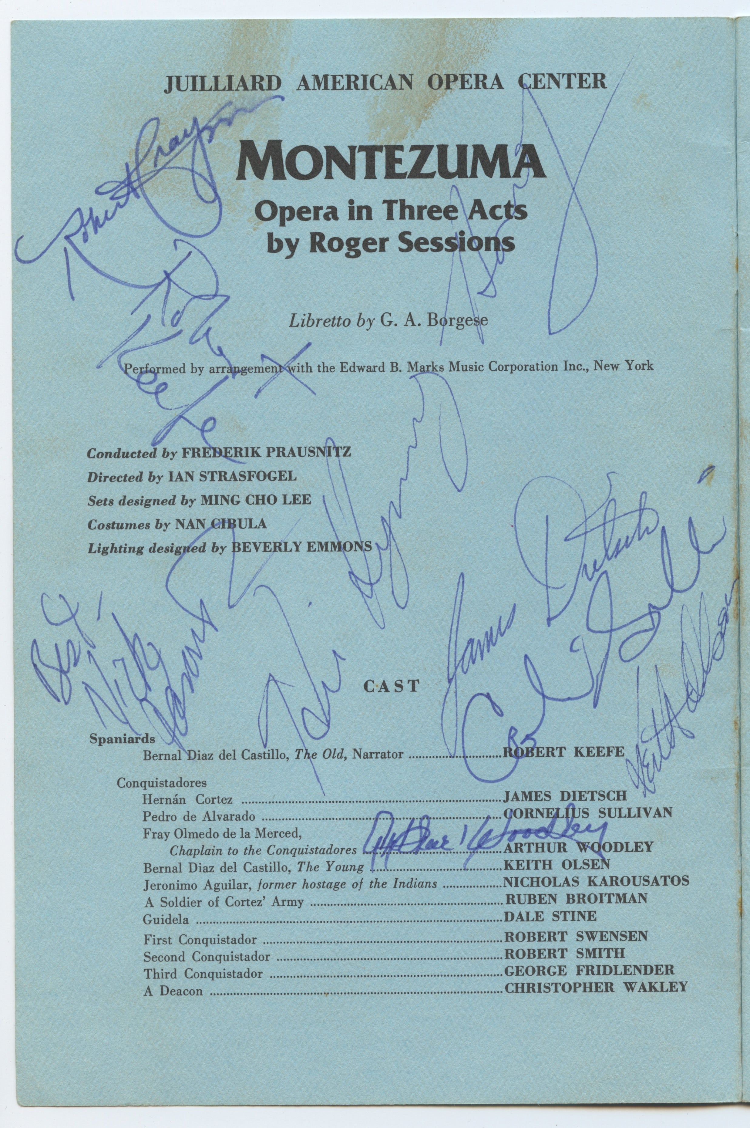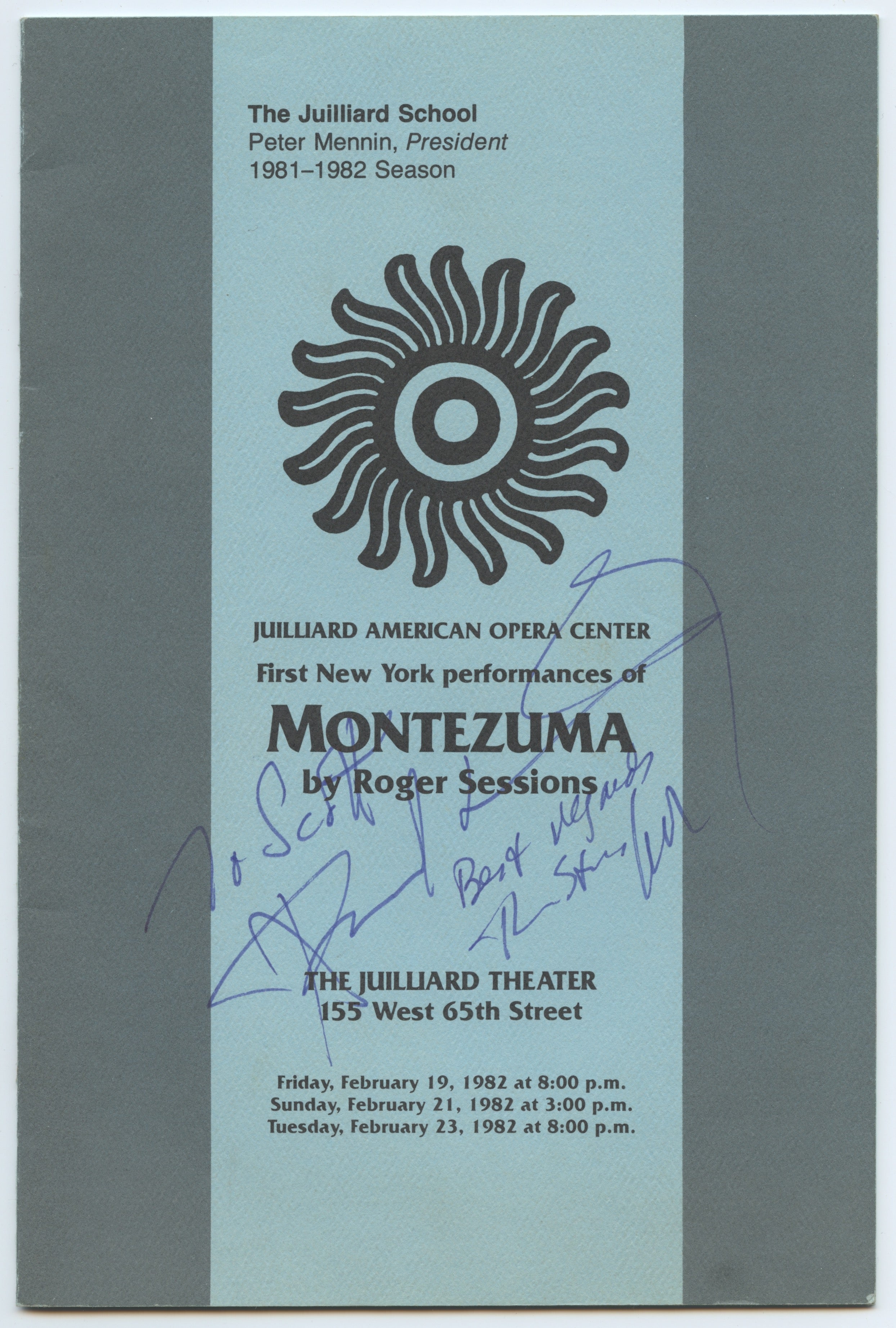 Sessions, Roger. (1896–1985). Montezuma - Signed Program. Signed program from the first New York performances of Roger Sessions' opera Montezuma, on February 19–23, 1982 at the Juilliard American Opera Center. Signed on the cover by Sessions and additionally inside by several members of the cast. One has added "It was lots of fun!?" and another "Yay, it's over!" 14 pp. Some areas of discoloration; overall very good. 6 x 9 inches (15.2 x 22.7 cm).