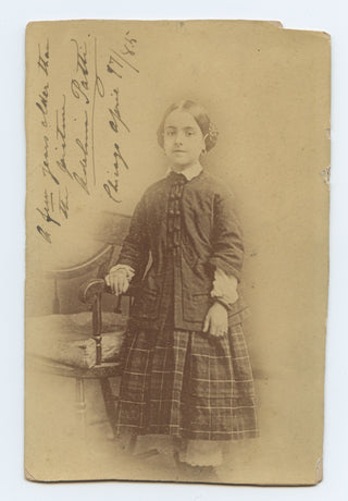 Signed cabinet photograph from the legendary soprano, who is shown as a girl, ca. age 10, and has signed and inscribed at the upper left: "A few years older than the picture / Adelina Patti / Chicago, April 17, 1885." Issued by Scholten of St. Louis. Trimmed, chip to the upper right corner, toning, and mounting remnants to the verso, with some notes in pencil; overall very good. 4 x 6 inches (10 x 15.2 cm). The earliest signed image we've seen!