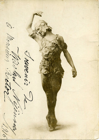 Nijinsky, Waslaw. (1889-1950) [Bert, Auguste.]. Signed Photograph in "Spectre de la Rose.". Rare original photograph of Nijinsky in Fokine's "Le Spectre de la rose," boldly signed and inscribed in black ink "Souvenir de / Waslaw Nijinsky / A Monsieur Rector 1916." Stamps on the verso ("Warslav Nijinsky," "Serge de Diaghileff's Ballet Russe," "The Metropolitan Ballet Co., Inc. Metropolitan Opera House New York"), lightly trimmed along the the lower edge, with small tears to the right blank edge, one repaired from verso with tape, light stains and surface creases throughout, but overall a fine signed example of an iconic image, uncredited on the present example but taken by Auguste Bert of Paris in 1911. 14.5 x 20 cm.