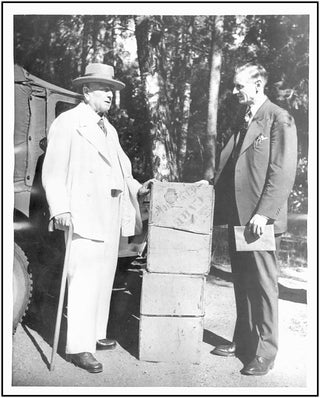 A very unusual original 8 x 10 inch photograph of the great Finnish composer. Lightly buckling, otherwise very good. Verso news clipping titled "Sibelius Receives Food from America," describes the delivery by "Finland of Care," of four forty-nine pound packages containing food sent from America: "The Sibeliuses, like everybody else in Finland, were very much interested in the subject of food and related how severely the shortage had affected them."