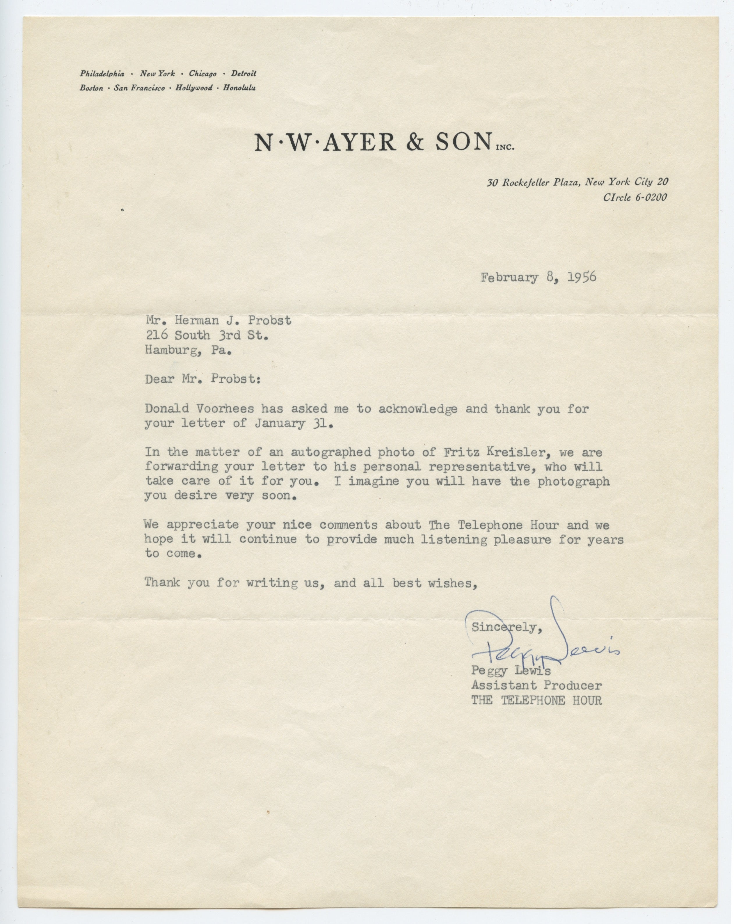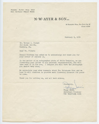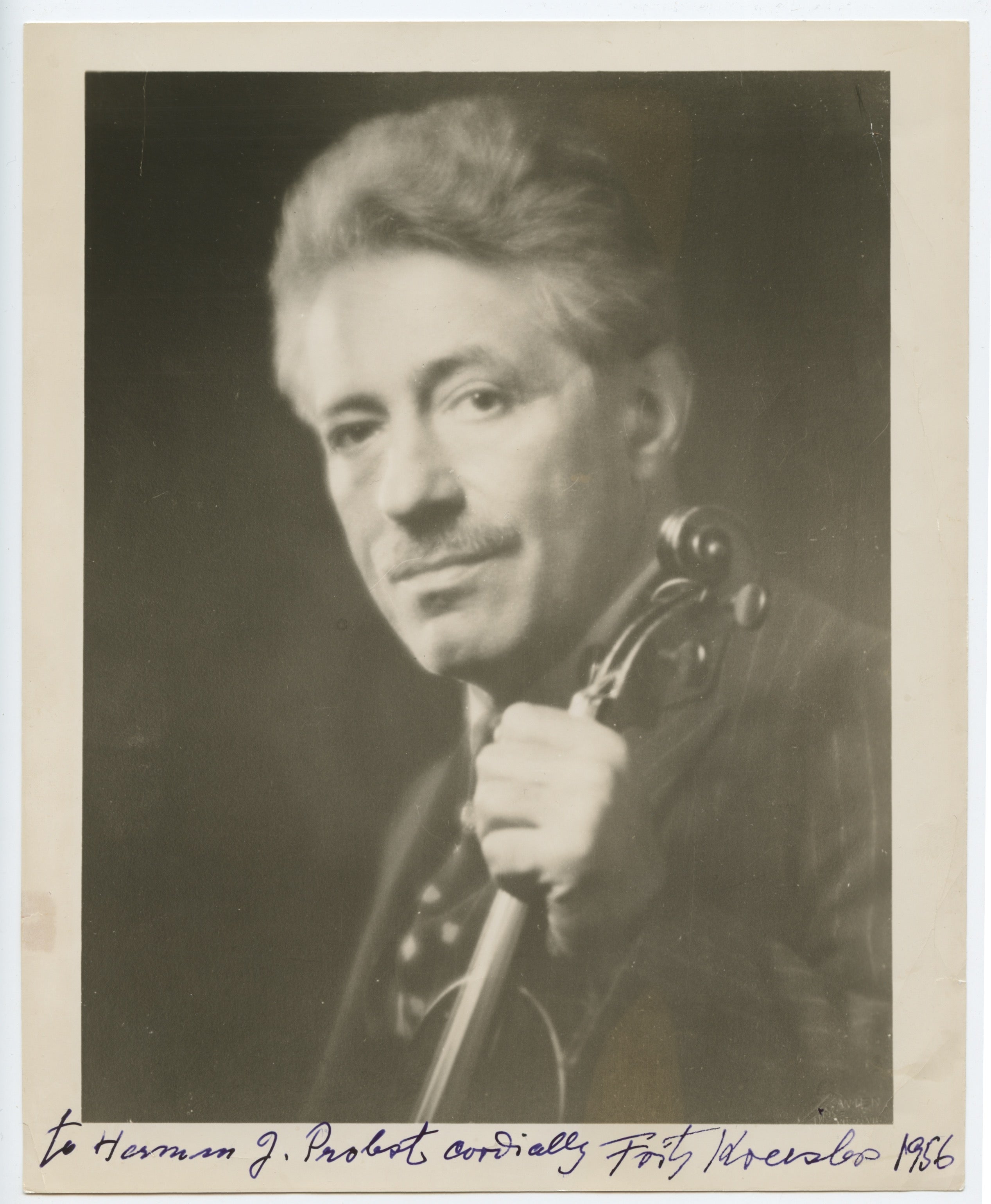 Signed photograph of the important violinist, who is shown in a portrait holding his instrument and has penned at the foot: "To Herman J. Probst, cordially Fritz Kreisler, 1956." Some light surface cracks; overall fine. 8 x 10 inches (20.5 x 25.3 cm). Together with a typed letter signed (February 8, 1956; 1 p.) from Peggy Lewis, assistant producer of the classical music radio and television program "The Telephone Hour" to Herman Probst, regarding obtaining the photograph of Kreisler.