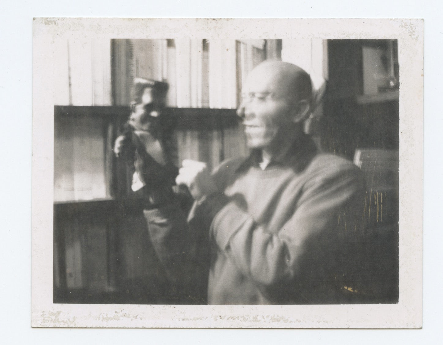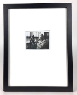 An extraordinary and rare original photograph taken by the British artist known for his emotionally charged imagery, fixation on personal motifs, and experimentation. Dye diffusion transfer print, taken ca. 1975 by Francis Bacon at the celebrated Parisian bookstore Librairie Le Minotaure, the image depicts - in a slightly blurred and unsettling fashion reminiscent of Bacon's painted oeuvre - the store's owner Roger Cornaille engaging with a Frankenstein hand puppet. The location and photographer are identified by the subject himself, a friend of the artist, in a handwritten caption on the verso: "Au Minotaure / vu par Francis Bacon!" The photograph is identified with the code on the verso "G511232," possibly establishing the date of film manufacture as July (G), [197]5 according to the dating of Polaroid's 7-digit codes. Some surface wear; overall very good. 4.25 x 3.5 inches (10.9 x 8.5 cm). From the Collection of Denis Cholet, author of "Le Minotaure: souvenirs d'une librairie de Paris, 1948 - 1987." Archivally framed to an overall size of 11 x 14 inches.